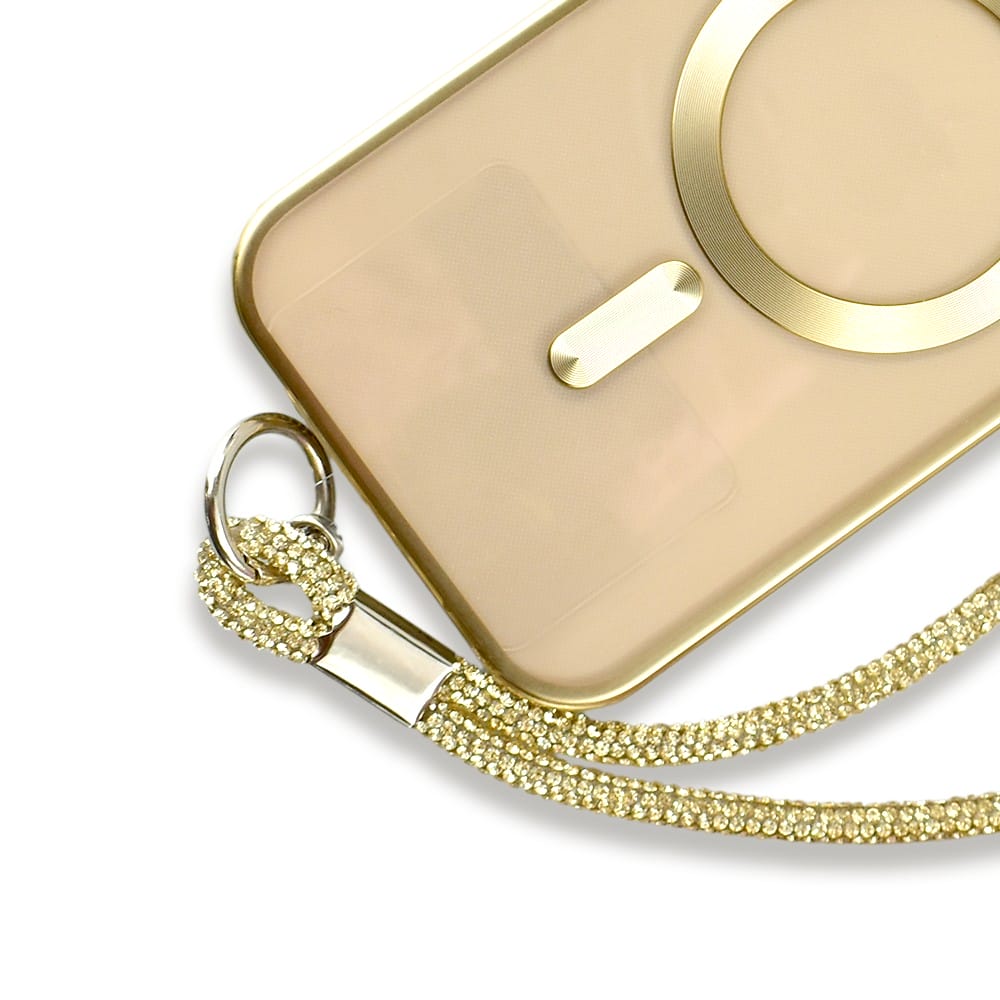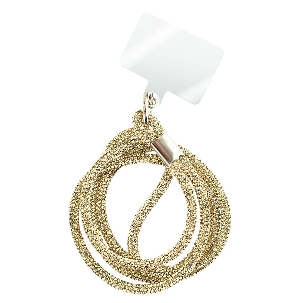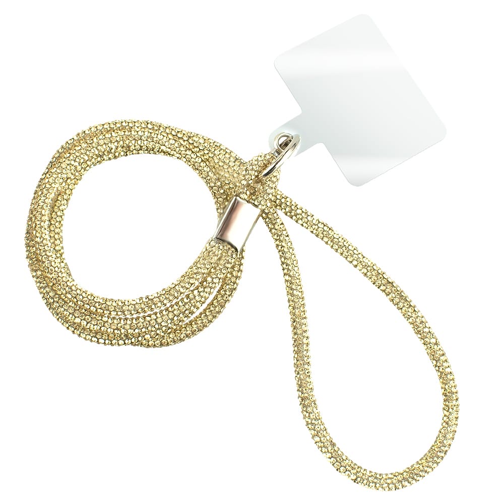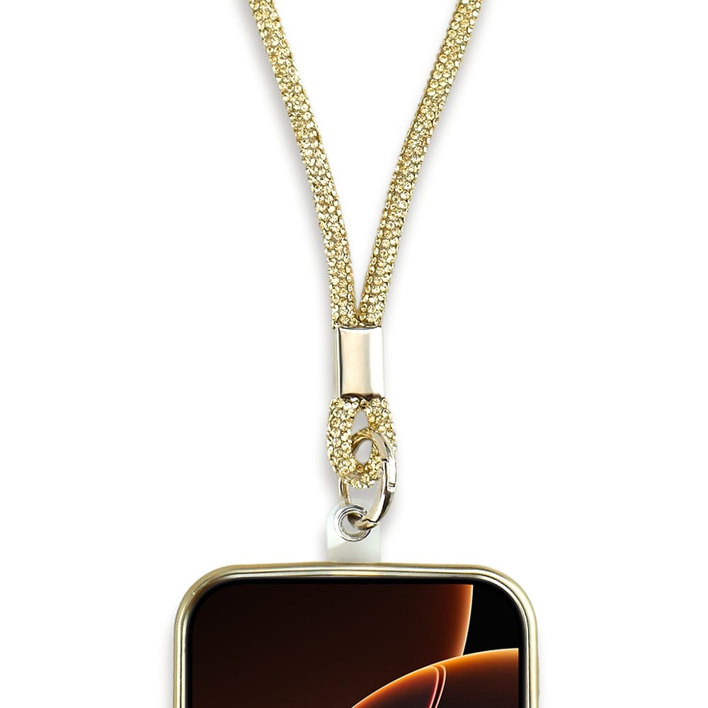 Długa smycz, pasek na szyję, ramię do telefonu, złota, błyszcząca
