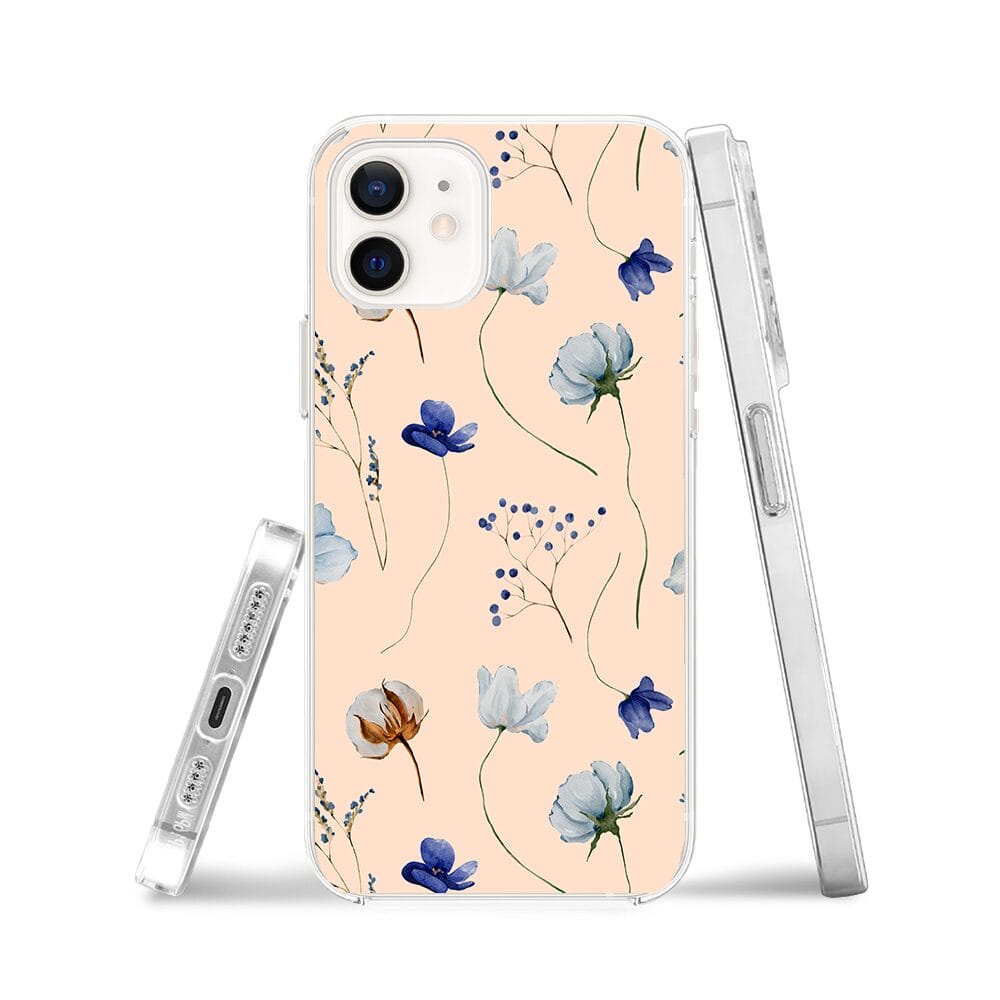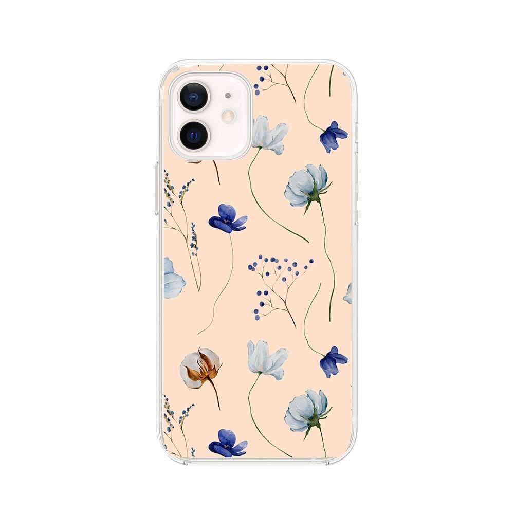 Etui do iPhone 12 Mini przeźroczyste, silikonowe Flexi, kwiatki niebieskie na pudrowym tle