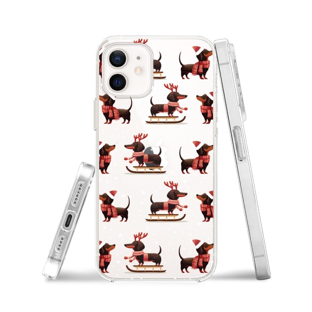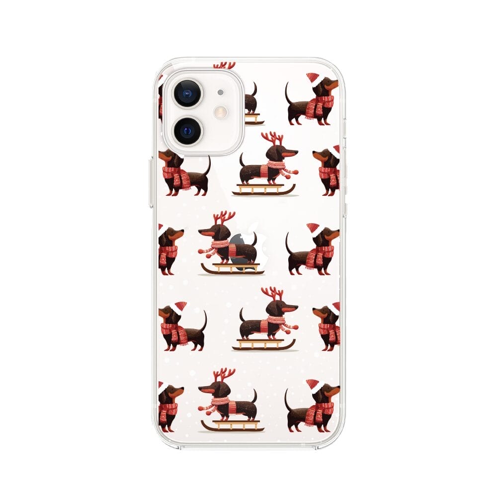 Etui do iPhone 12 Mini przeźroczyste, silikonowe Flexi, Przytulne święta, Jamniki na saniach