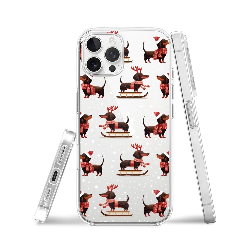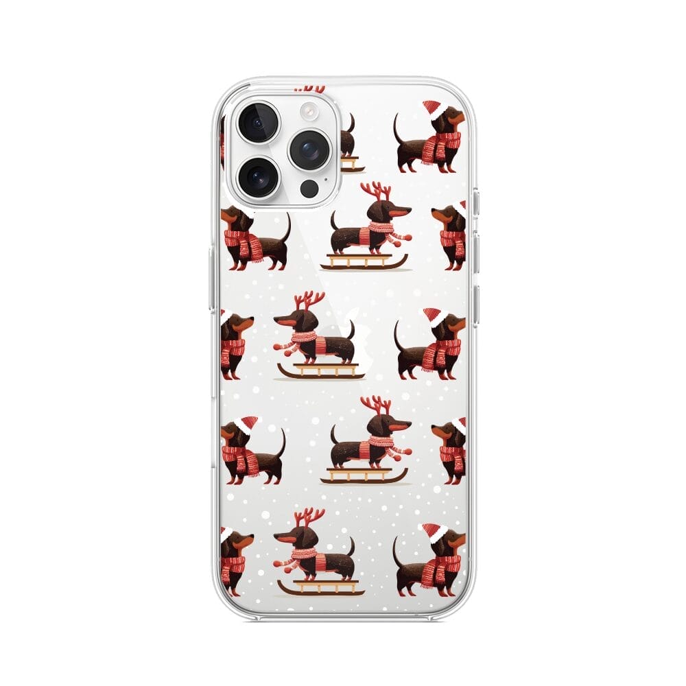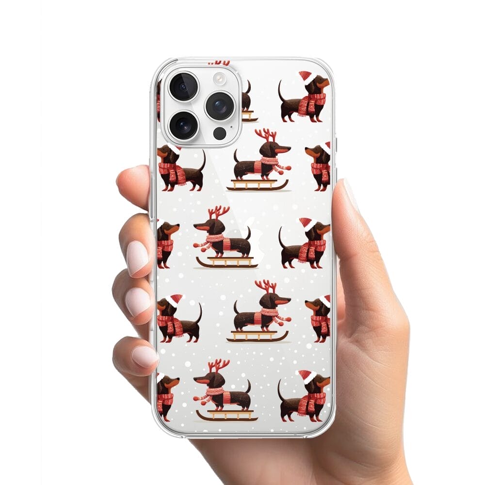 Etui do iPhone 12 Pro Max przeźroczyste, silikonowe Flexi, Przytulne święta, Jamniki na saniach