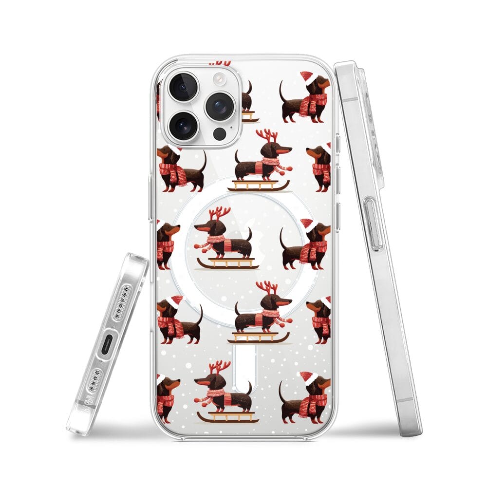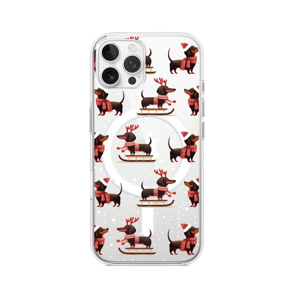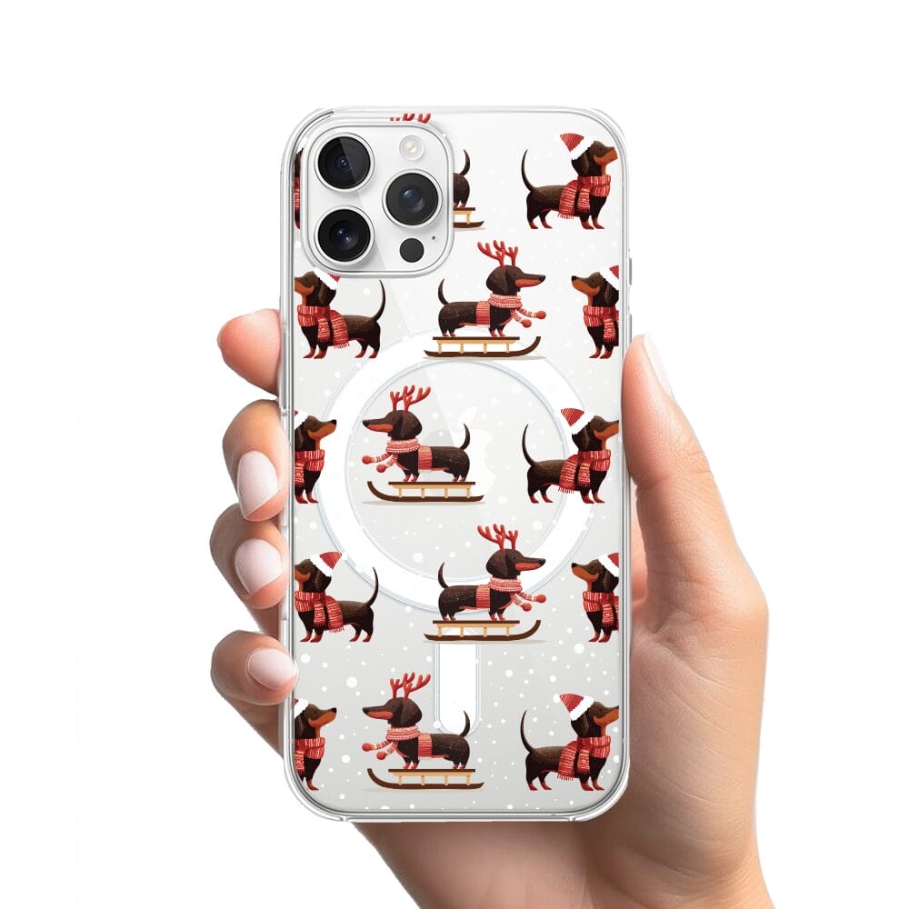 Etui do iPhone 12 Pro z MagSafe przeźroczyste, silikonowe Flexi, Przytulne święta, Jamniki na saniach