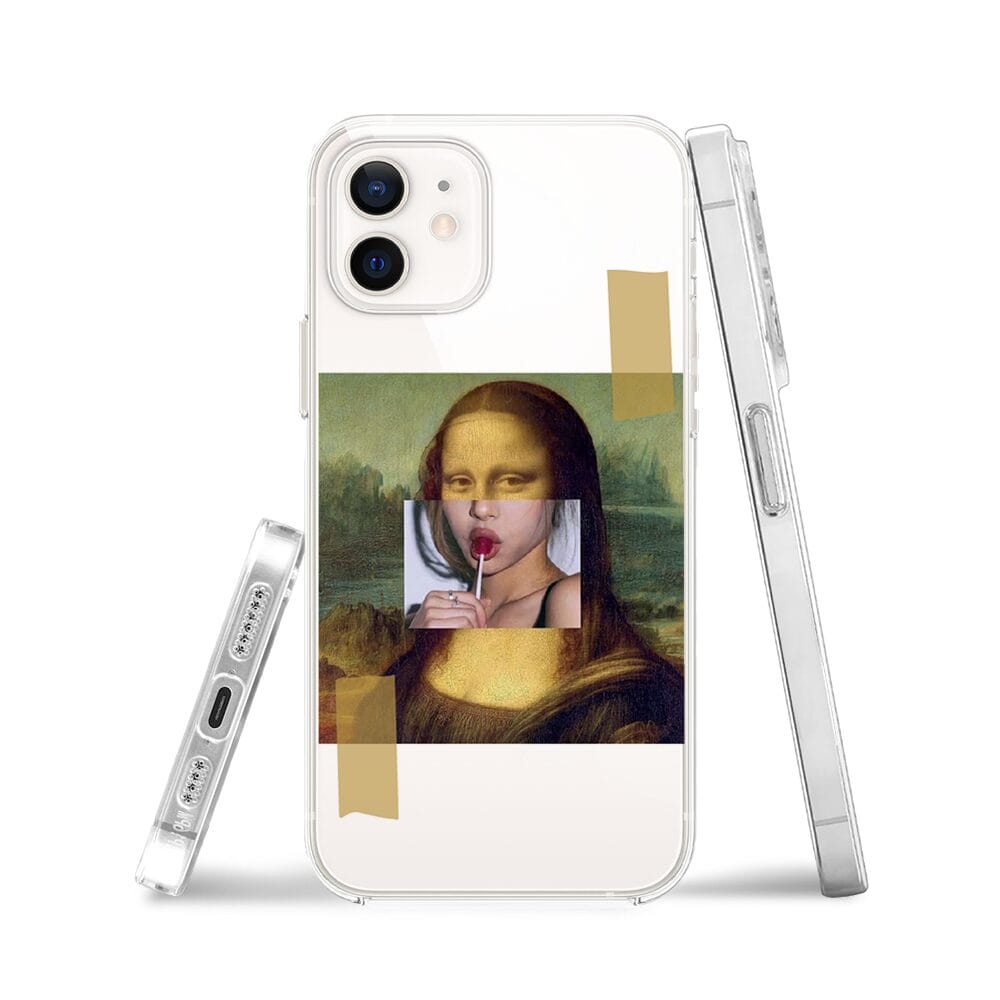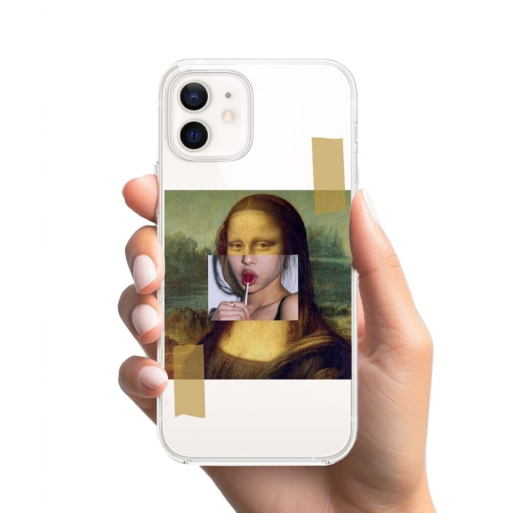 Etui do iPhone 12 przeźroczyste, silikonowe Flexi, Mona Lisa z lizakiem