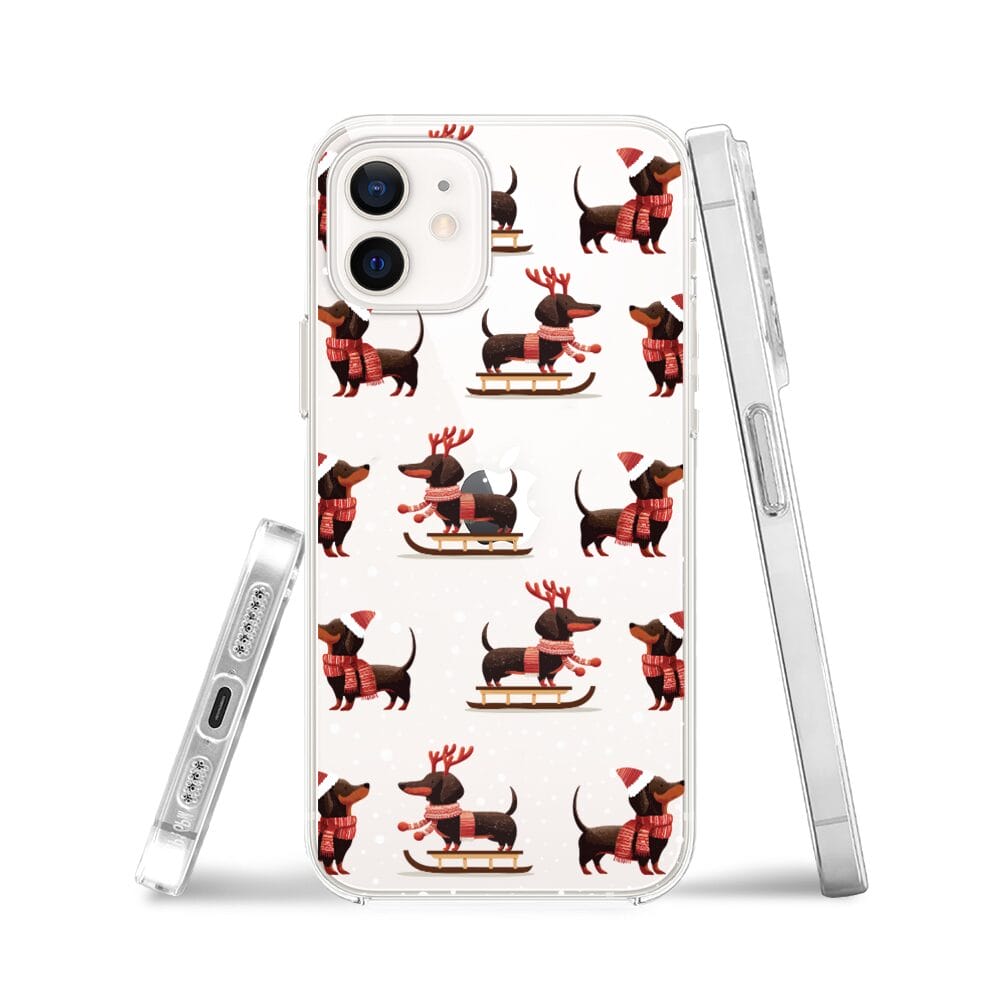 Etui do iPhone 12 przeźroczyste, silikonowe Flexi, Przytulne święta, Jamniki na saniach