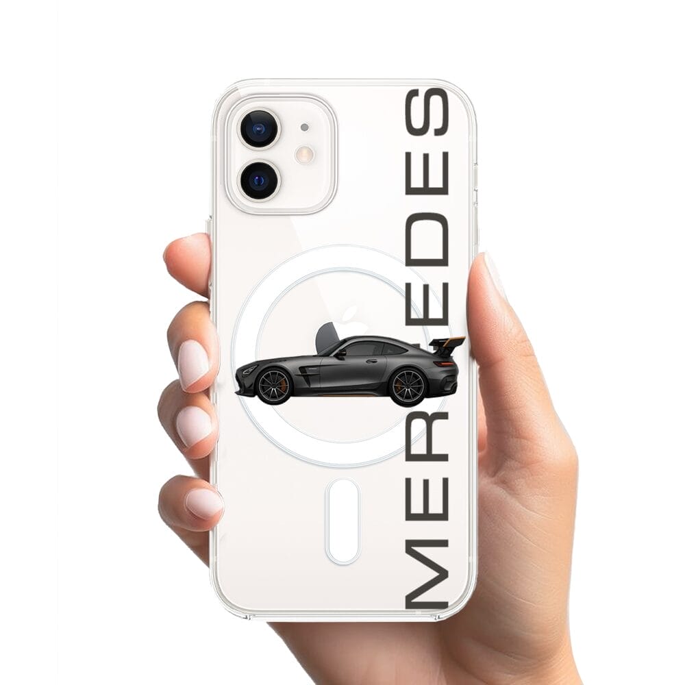 Etui do iPhone 12 z MagSafe przeźroczyste, silikonowe Flexi, Szybkie Auta, Stalowe AMG-GT