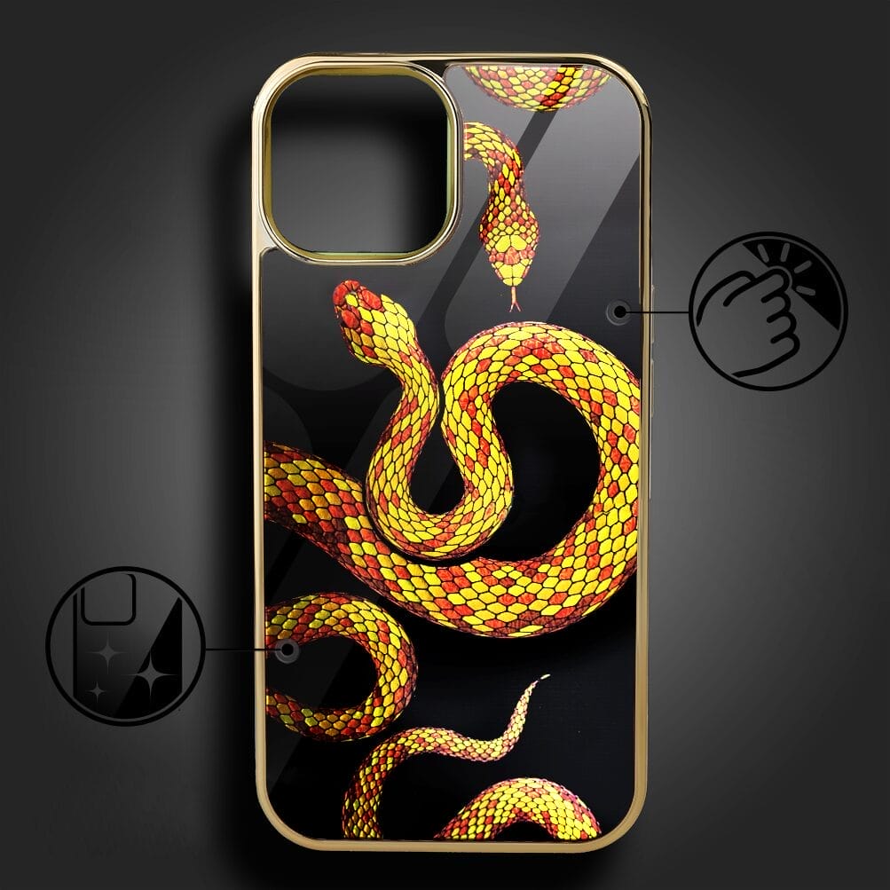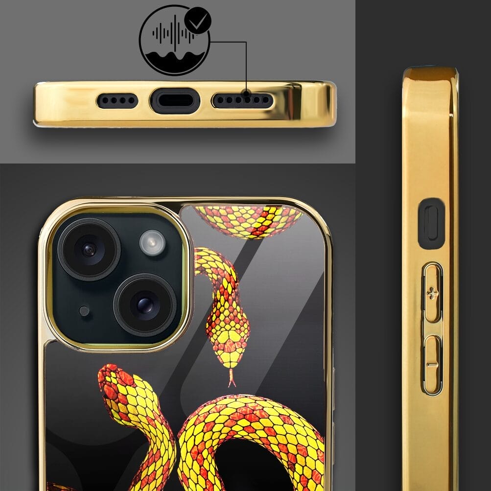 Etui do iPhone 13 IBIZU Elite Glass, szklany tył, węże ze złotem, złote