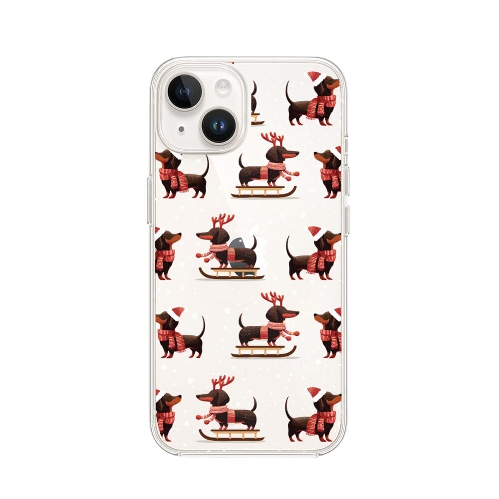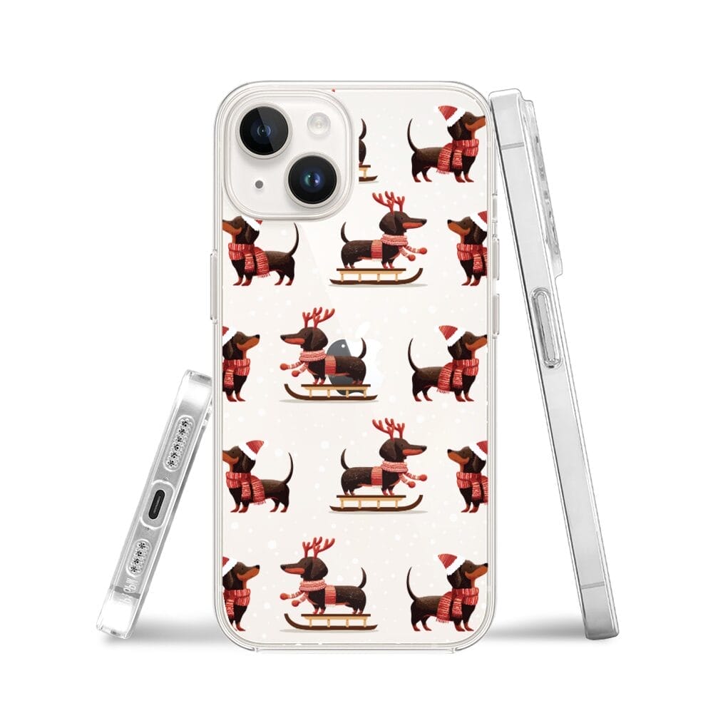 Etui do iPhone 13 Mini przeźroczyste, silikonowe Flexi, Przytulne święta, Jamniki na saniach