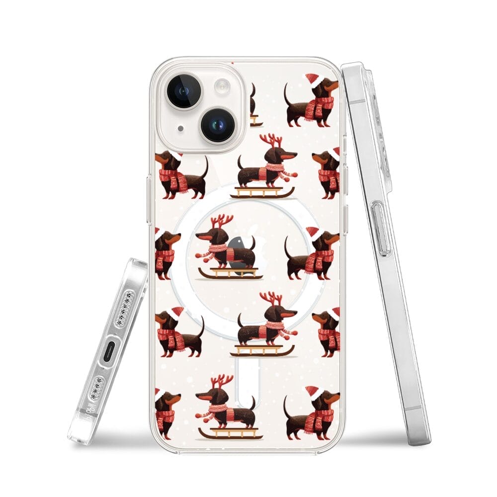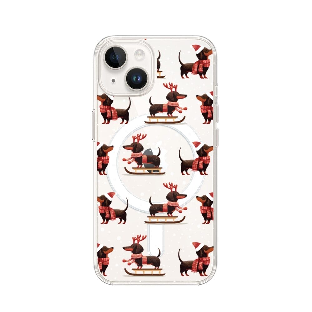 Etui do iPhone 14 z MagSafe przeźroczyste, silikonowe Flexi, Przytulne święta, Jamniki na saniach