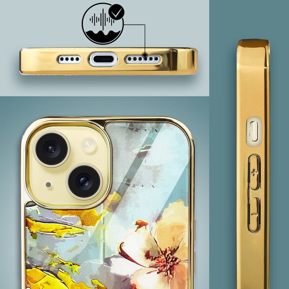 Etui do iPhone 15 IBIZU Elite Glass, szklany tył, kwiaty ze złotem, złote