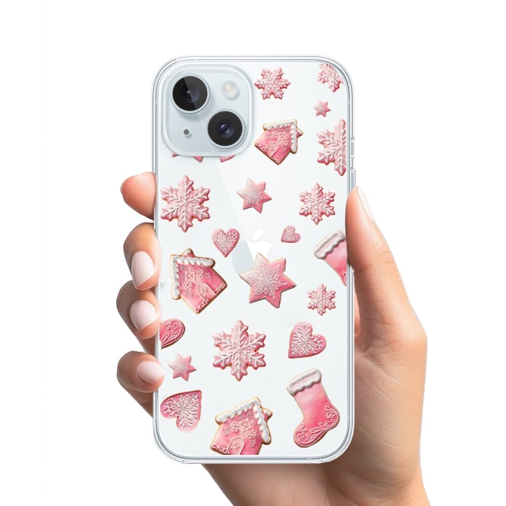 Etui do iPhone 15 Plus przeźroczyste, silikonowe Flexi, Przytulne święta, Różowe pierniczki