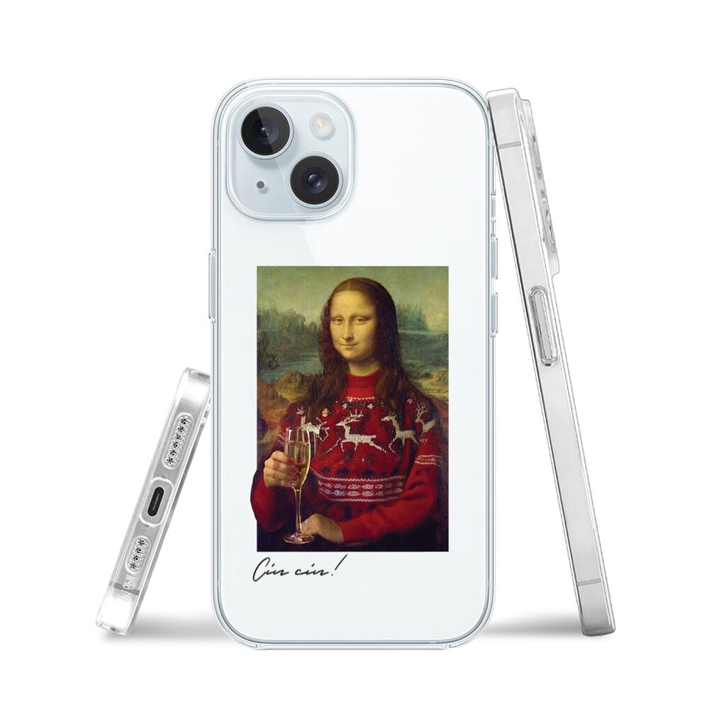 Etui do iPhone 15 Plus przeźroczyste, silikonowe Flexi, świąteczna Mona Lisa z szampanem