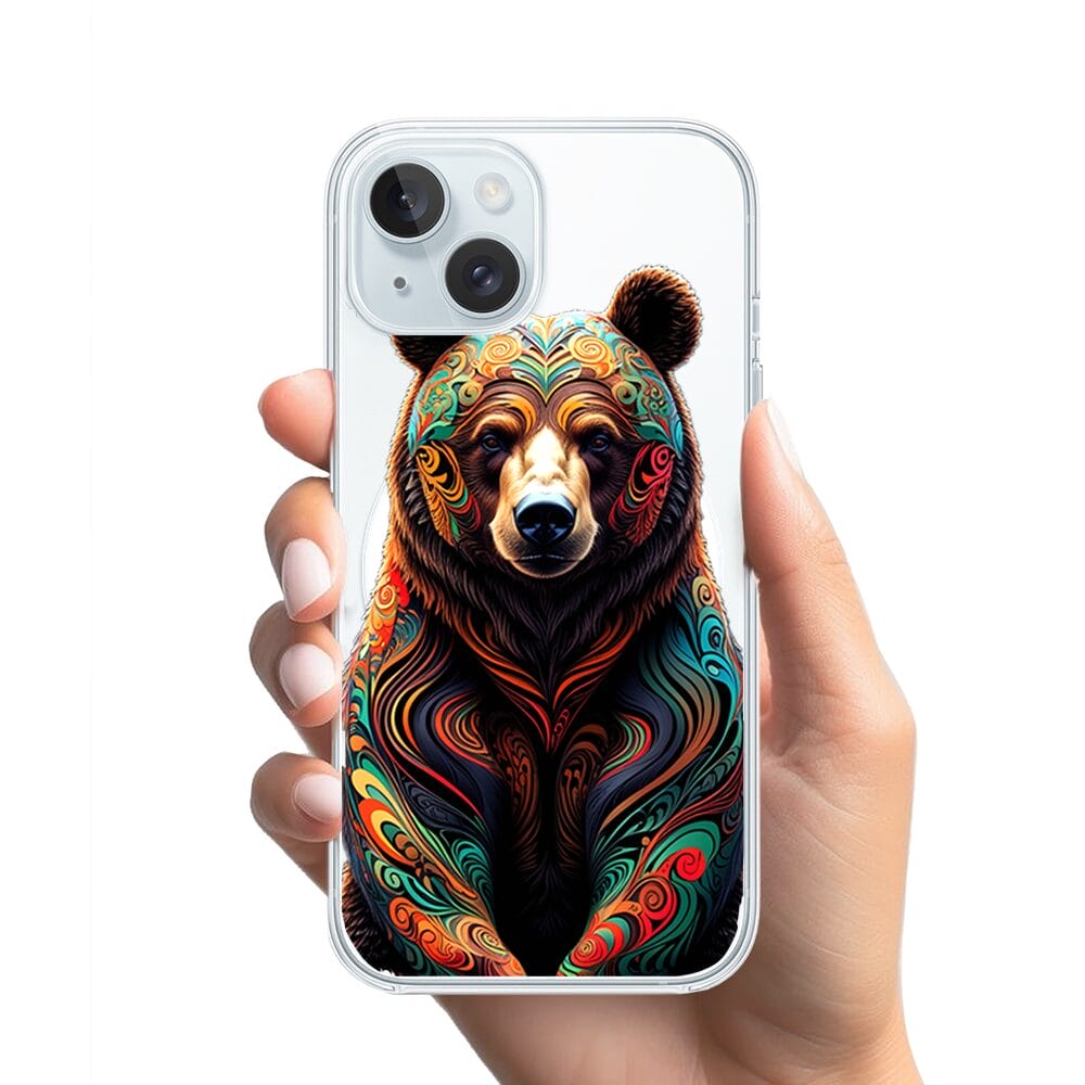 Etui do iPhone 15 Plus z MagSafe przeźroczyste, silikonowe Flexi, Dzika Mandala, Niedźwiedź