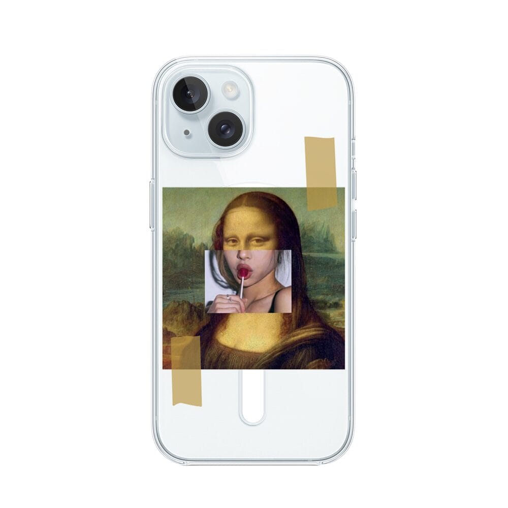 Etui do iPhone 15 Plus z MagSafe przeźroczyste, silikonowe Flexi, Mona Lisa z lizakiem