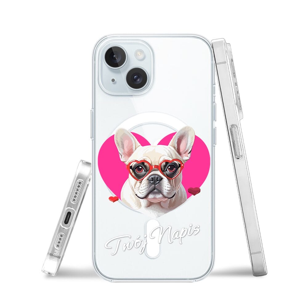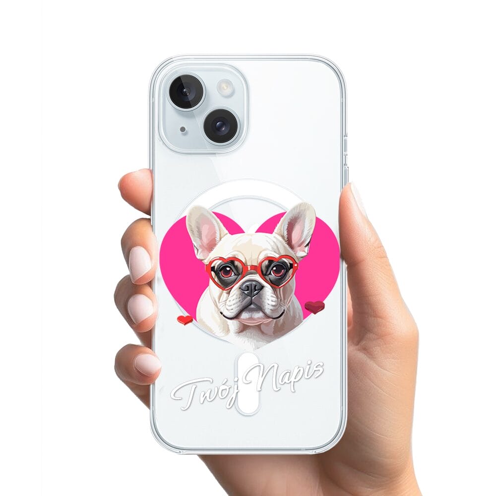 Etui do iPhone 15 Plus z MagSafe przeźroczyste, silikonowe Flexi, Puppy Love, pies rasy Buldog Francuski