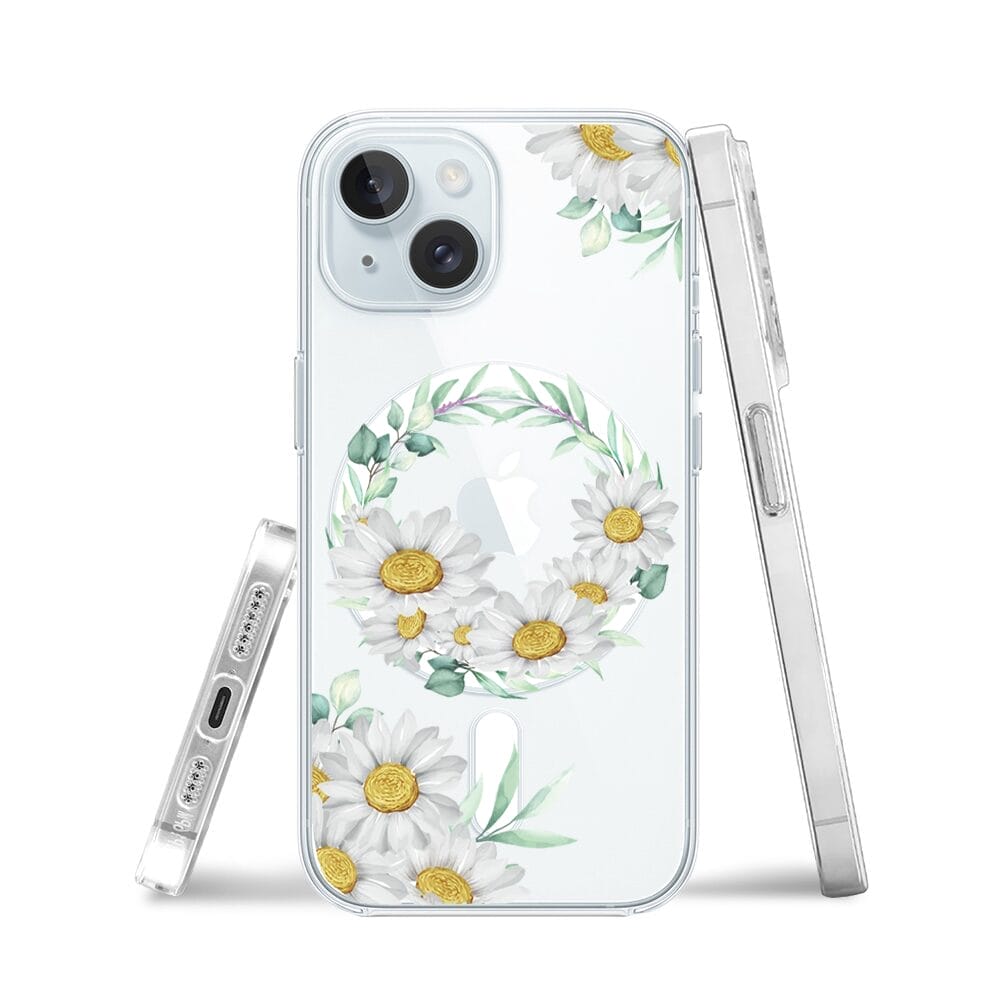Etui do iPhone 15 Plus z MagSafe przeźroczyste, silikonowe Flexi, wianek stokrotek