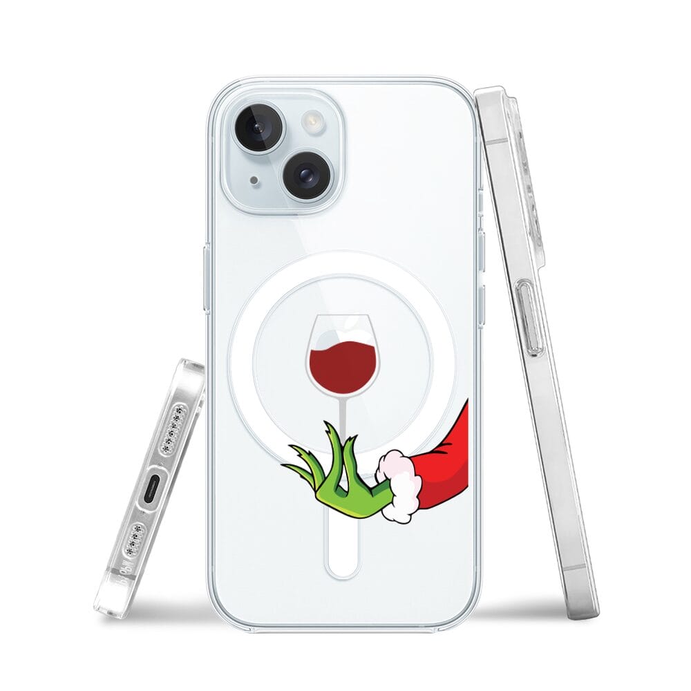 Etui do iPhone 15 Plus z MagSafe przeźroczyste, silikonowe Flexi, Zielony psotnik z lampką wina
