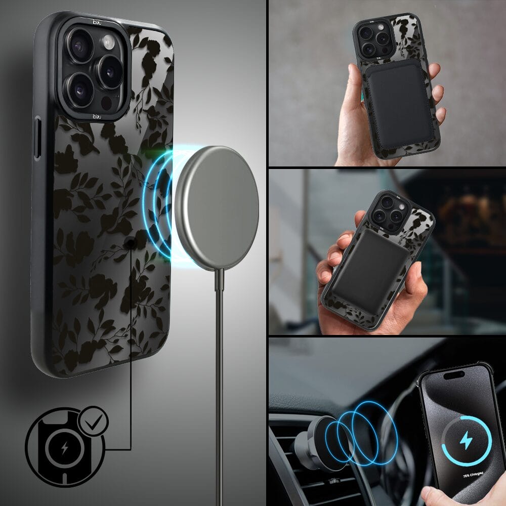 Etui do iPhone 15 Pro IBIZU DropGuard Matt z MagSafe, Midnight Mirror, Cienie liści