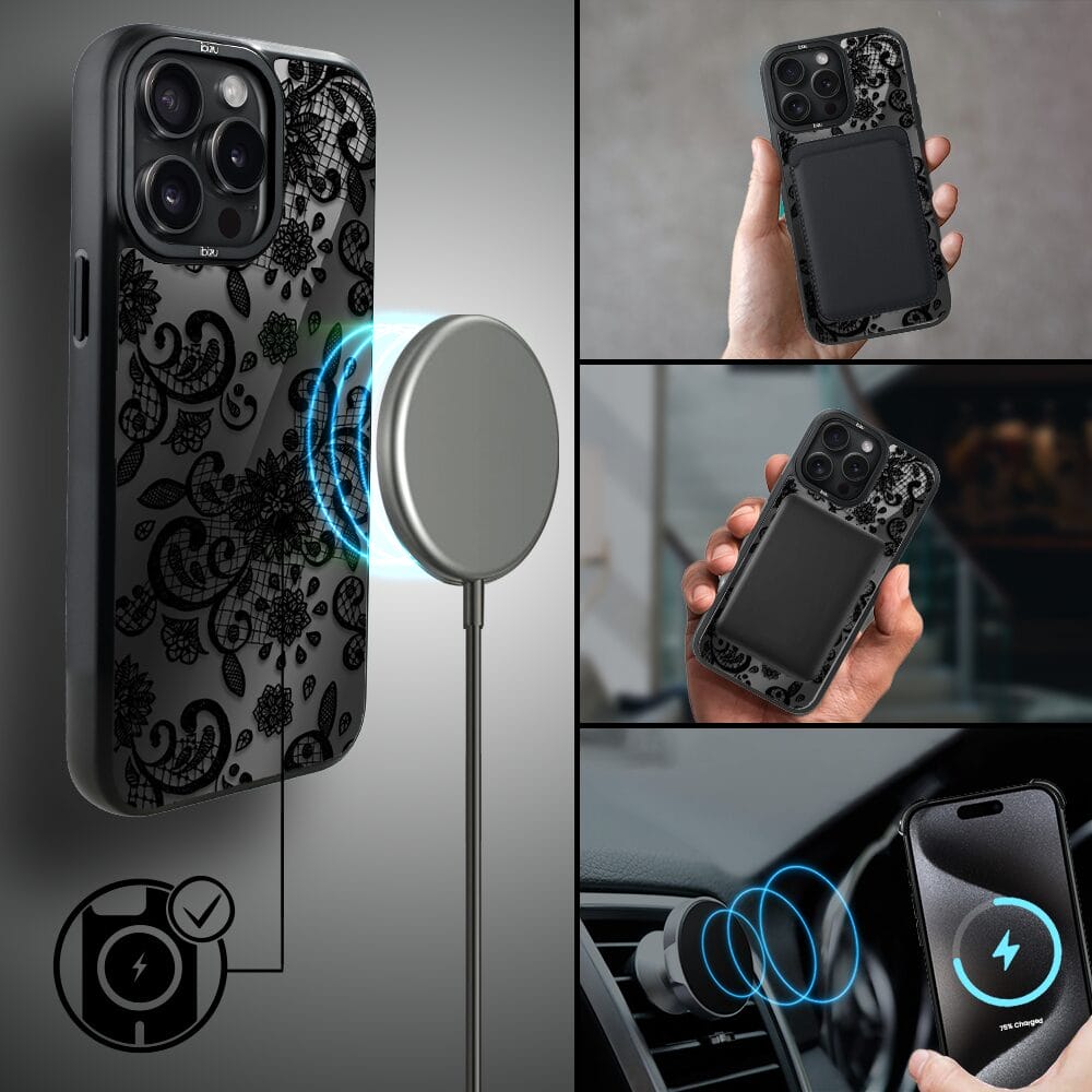 Etui do iPhone 15 Pro IBIZU DropGuard Matt z MagSafe, Midnight, Koronkowa czerń