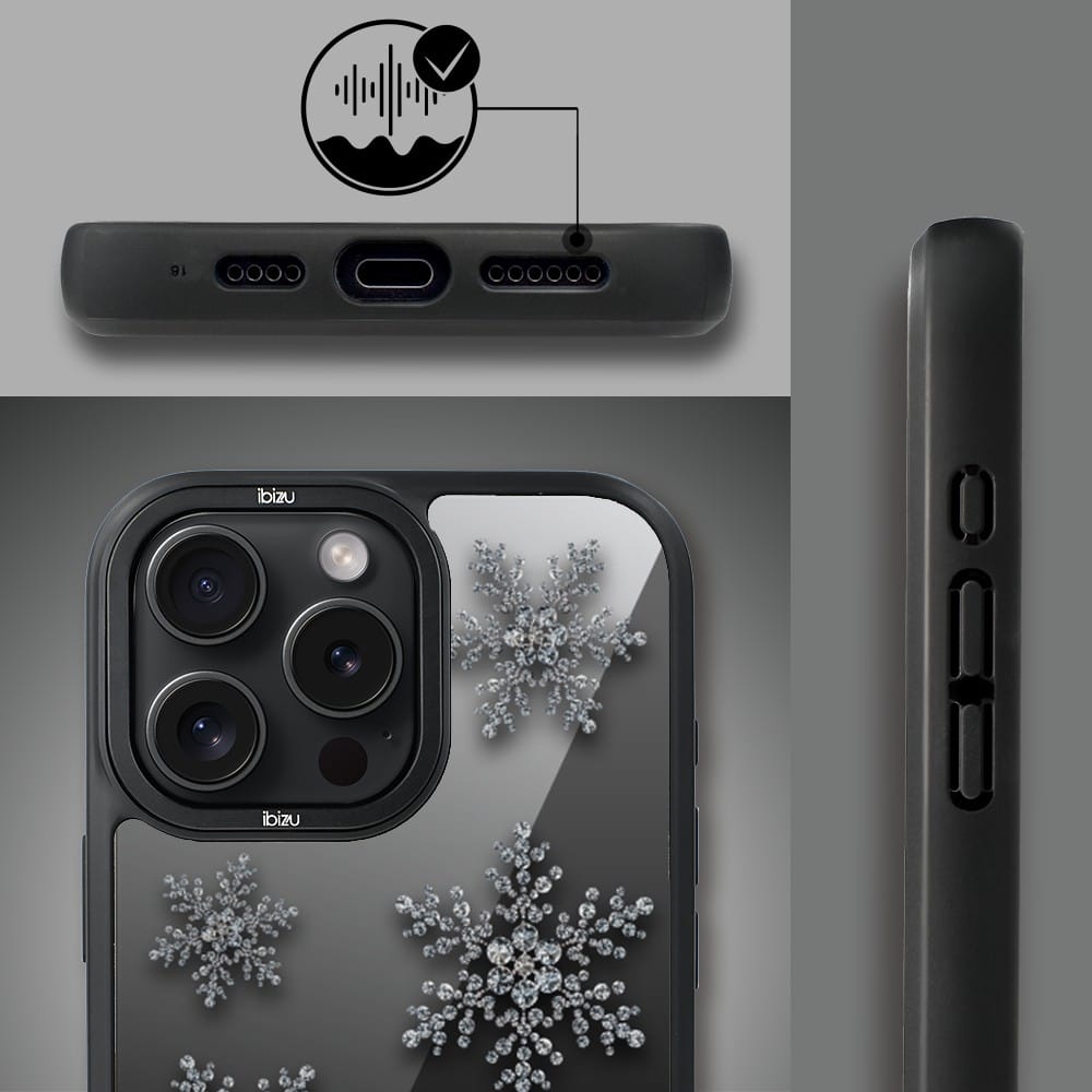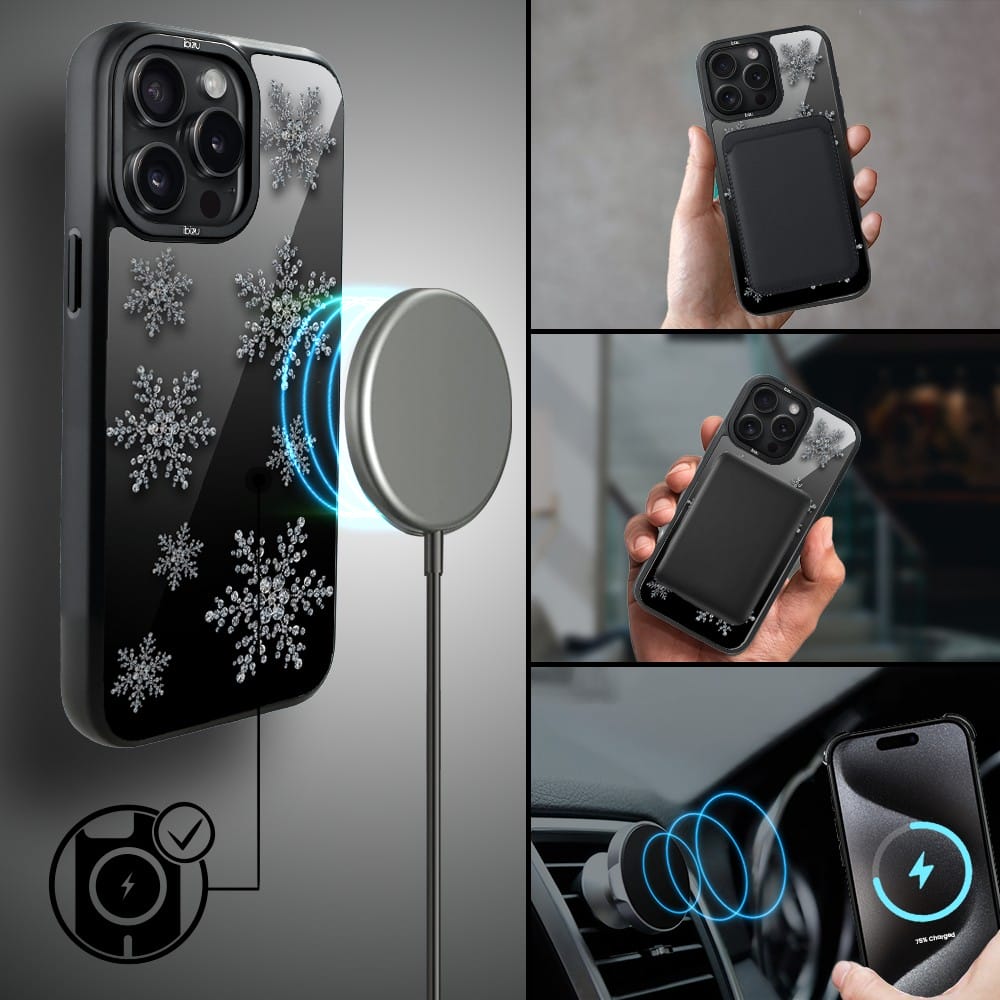 Etui do iPhone 15 Pro IBIZU DropGuard Matt z MagSafe, Zimowa magia, Płatki śniegu na czarnym lustrze