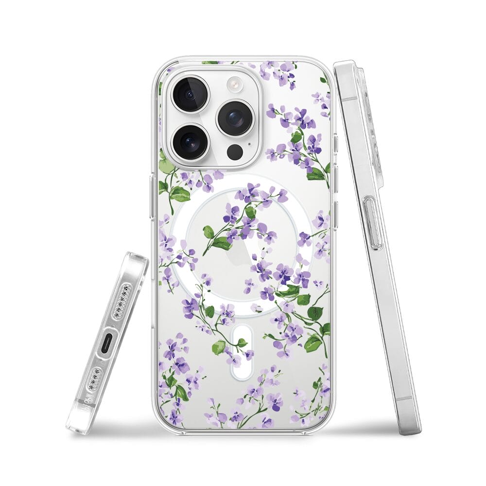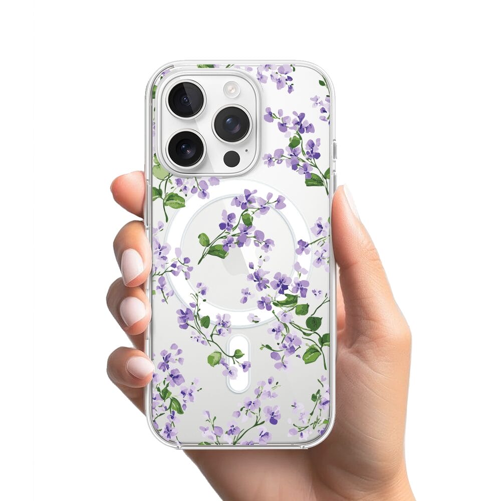 Etui do iPhone 15 Pro Max z MagSafe przeźroczyste, silikonowe Flexi, Fioletowe Bratki