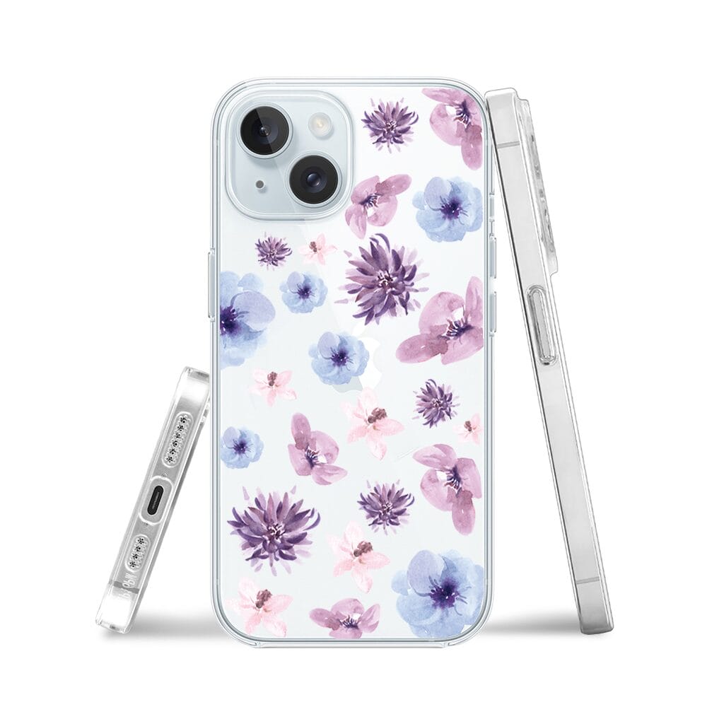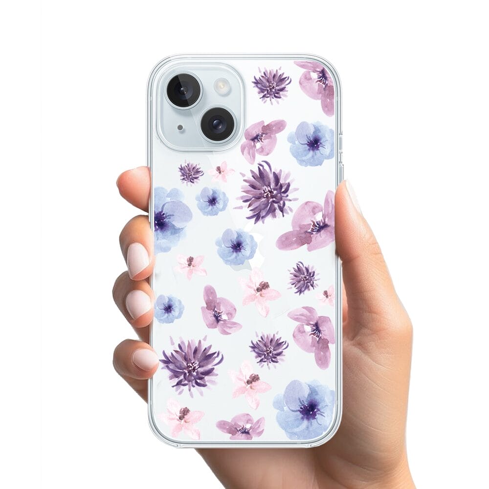 Etui do iPhone 15 przeźroczyste, silikonowe Flexi, kwiatki niebieskie, fioletowe