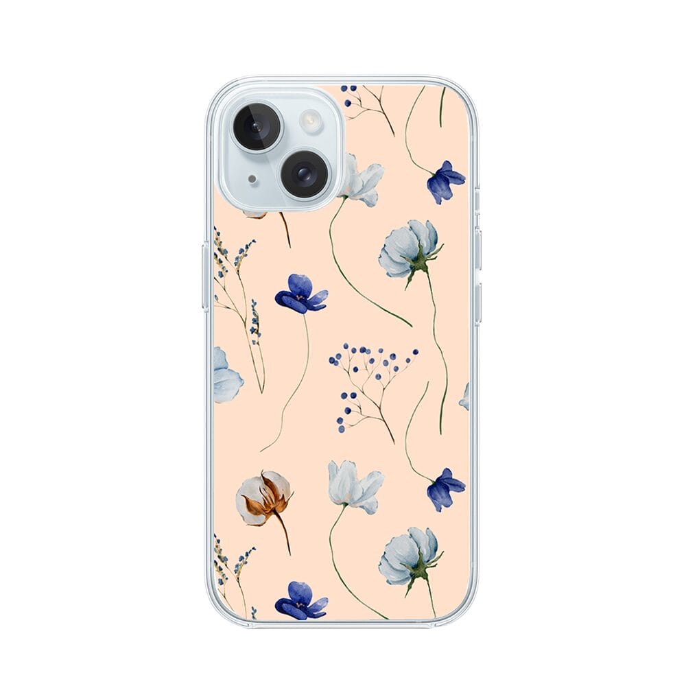 Etui do iPhone 15 przeźroczyste, silikonowe Flexi, kwiatki niebieskie na pudrowym tle