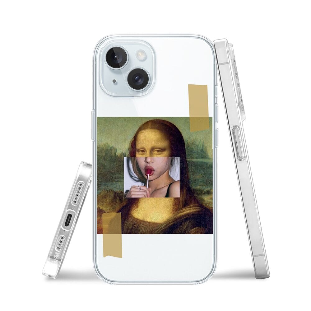 Etui do iPhone 15 przeźroczyste, silikonowe Flexi, Mona Lisa z lizakiem
