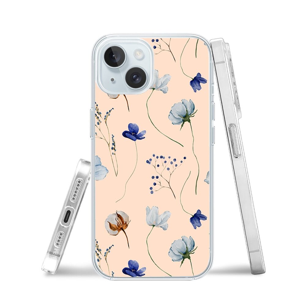 Etui do iPhone 15 z MagSafe przeźroczyste, silikonowe Flexi, kwiatki niebieskie na pudrowym tle