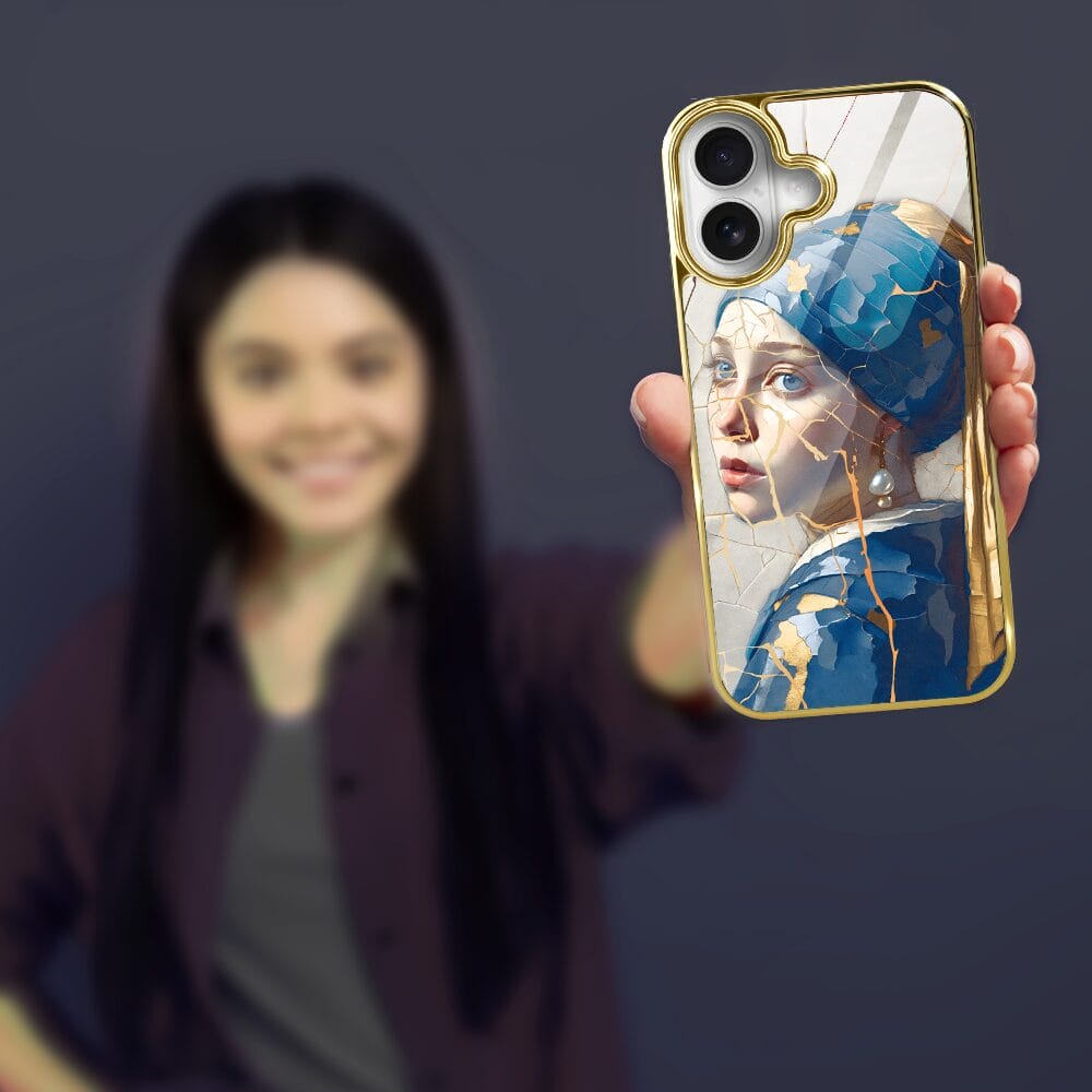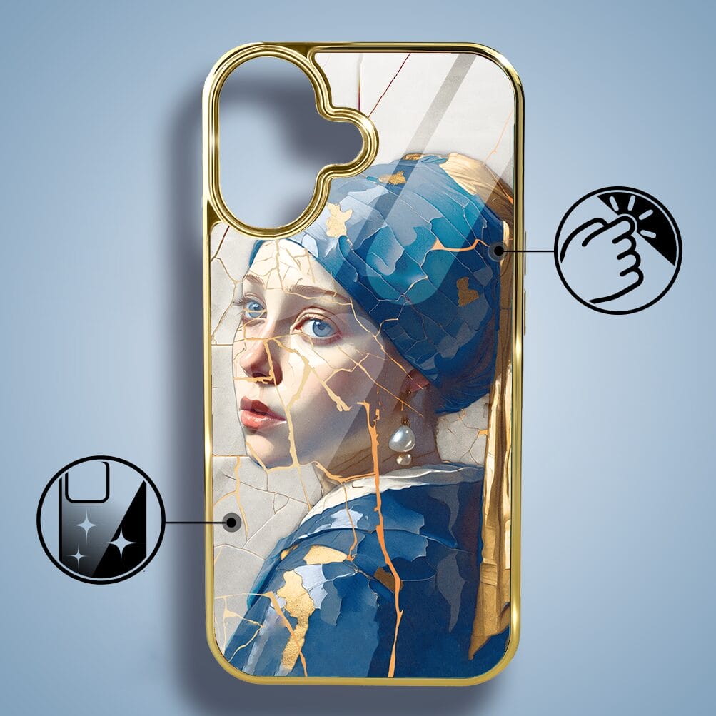 Etui do iPhone 16 IBIZU Elite Glass z MagSafe, Kintsugi Art, kobieta z perłą, złote