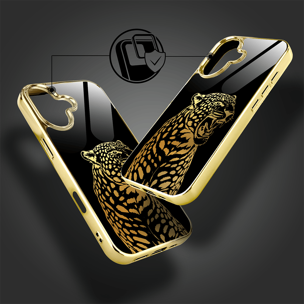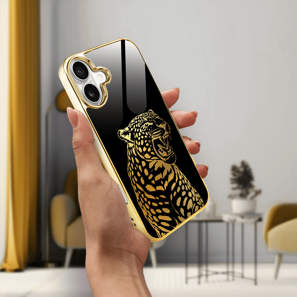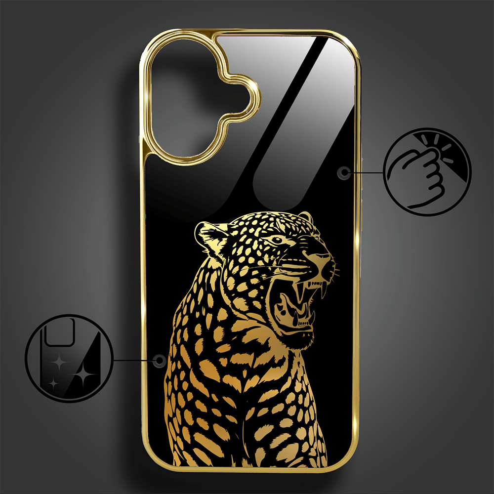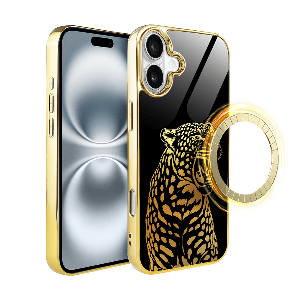 Etui do iPhone 16 IBIZU Elite Glass z MagSafe Golden Midnight, Ryczący Jaguar, złote