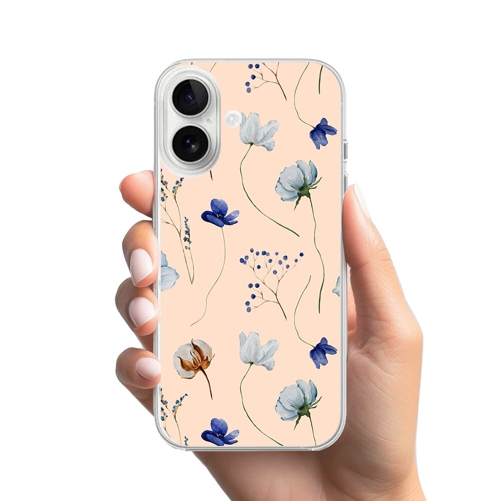 Etui do iPhone 16 Plus przeźroczyste, silikonowe Flexi, kwiatki niebieskie na pudrowym tle