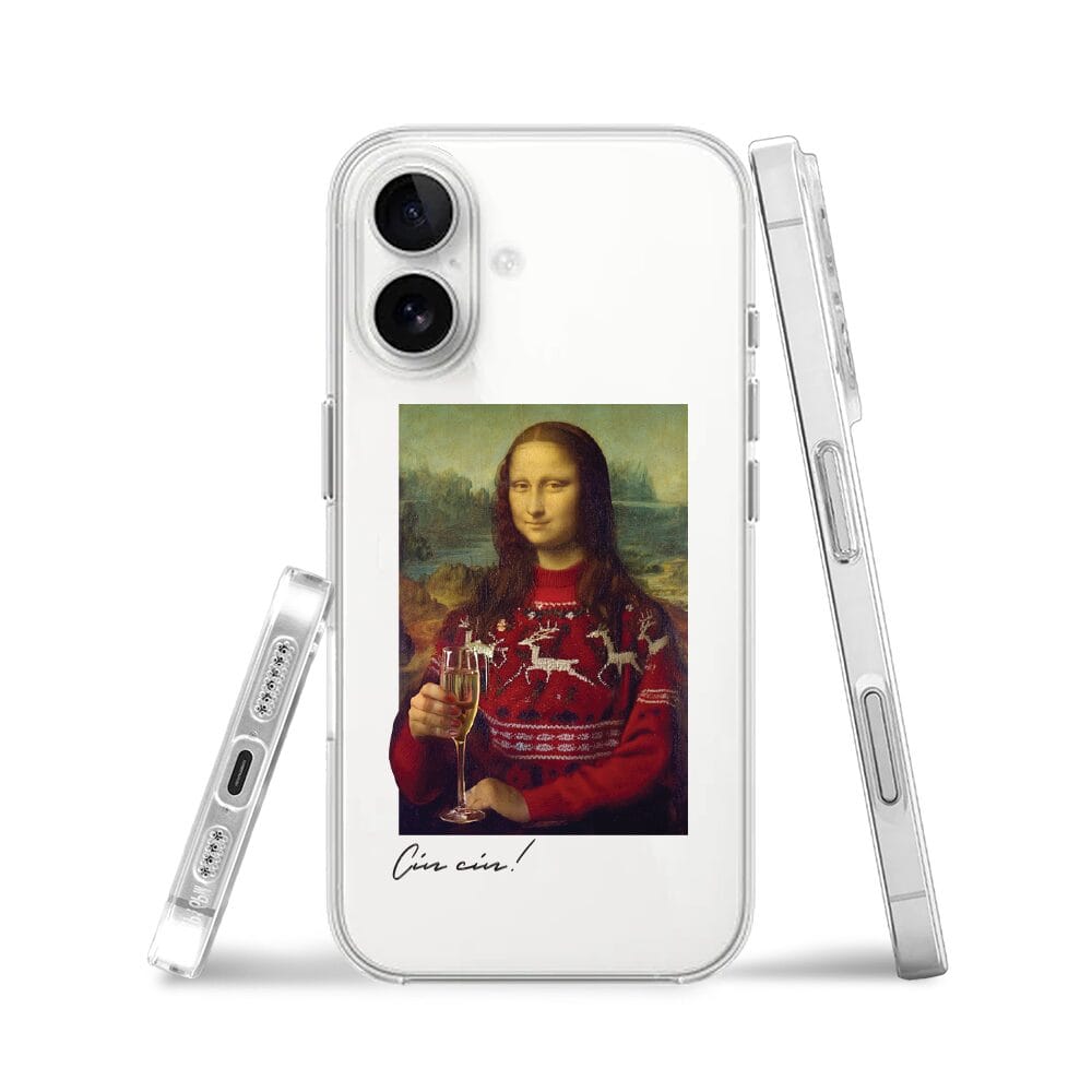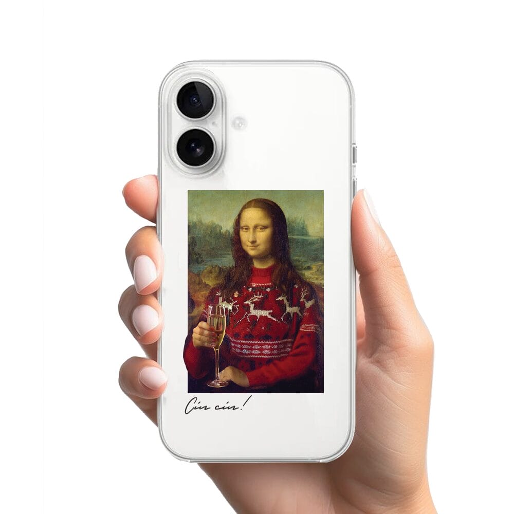 Etui do iPhone 16 Plus świąteczna Mona Lisa z szampanem, przeźroczyste