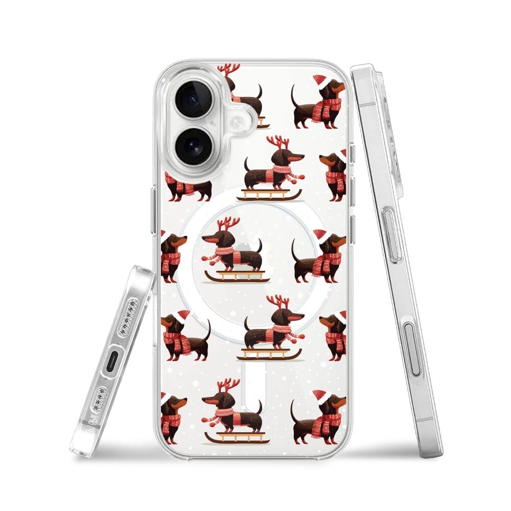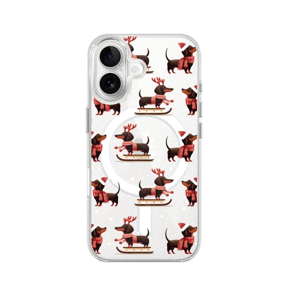 Etui do iPhone 16 Plus z MagSafe przeźroczyste, silikonowe Flexi, Przytulne święta, Jamniki na saniach