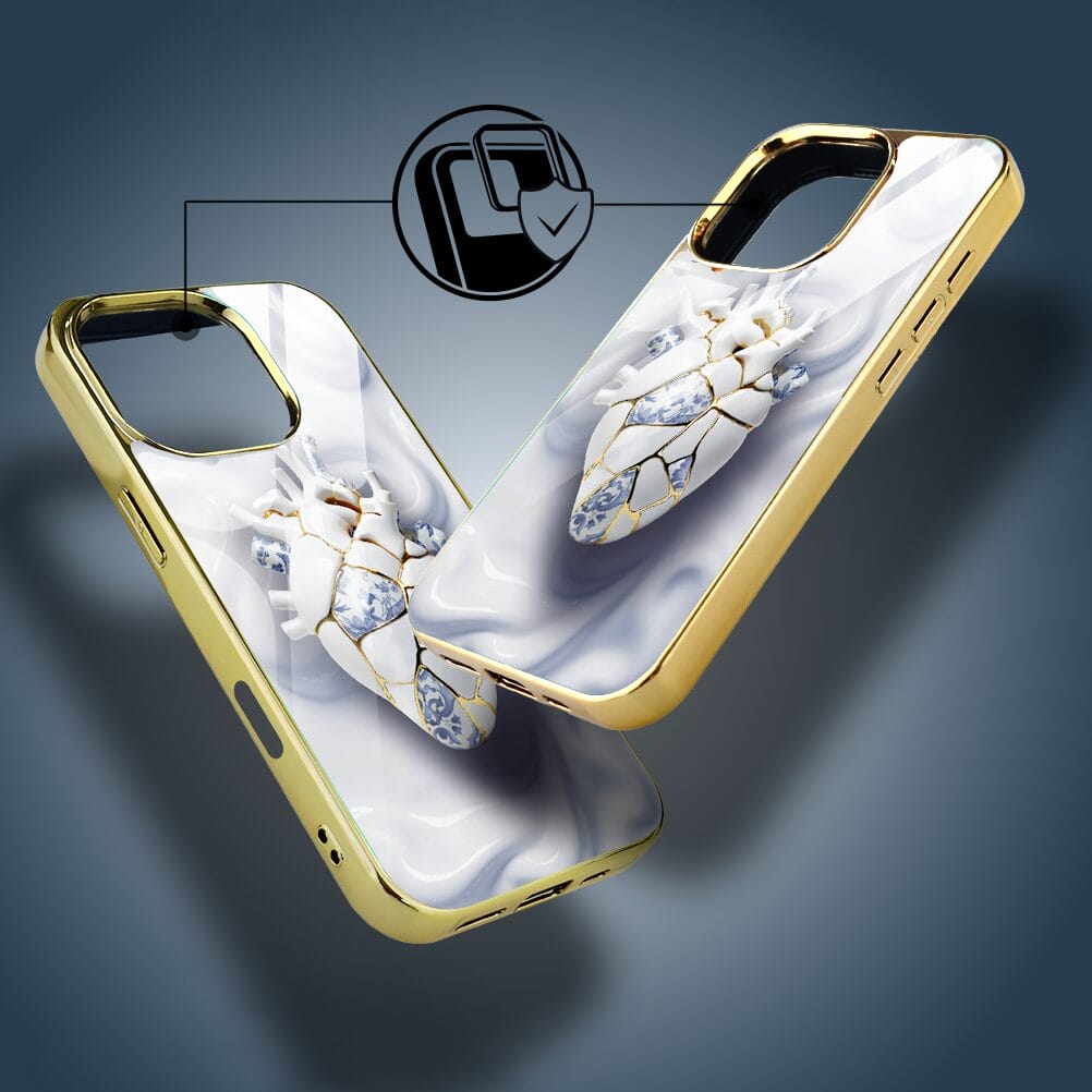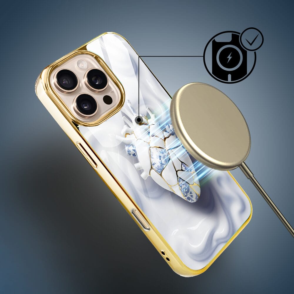 Etui do iPhone 16 Pro IBIZU Elite Glass z MagSafe, Kintsugi Art, porcelanowe serce, złote