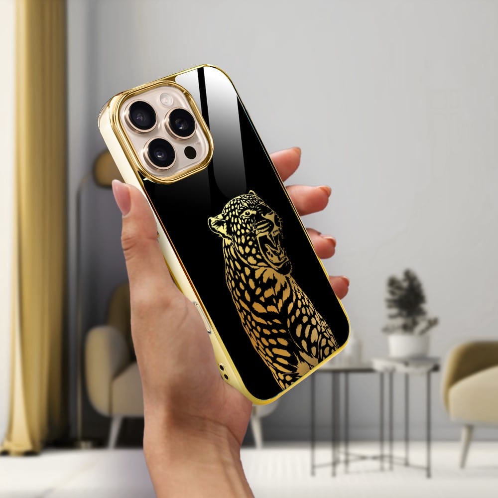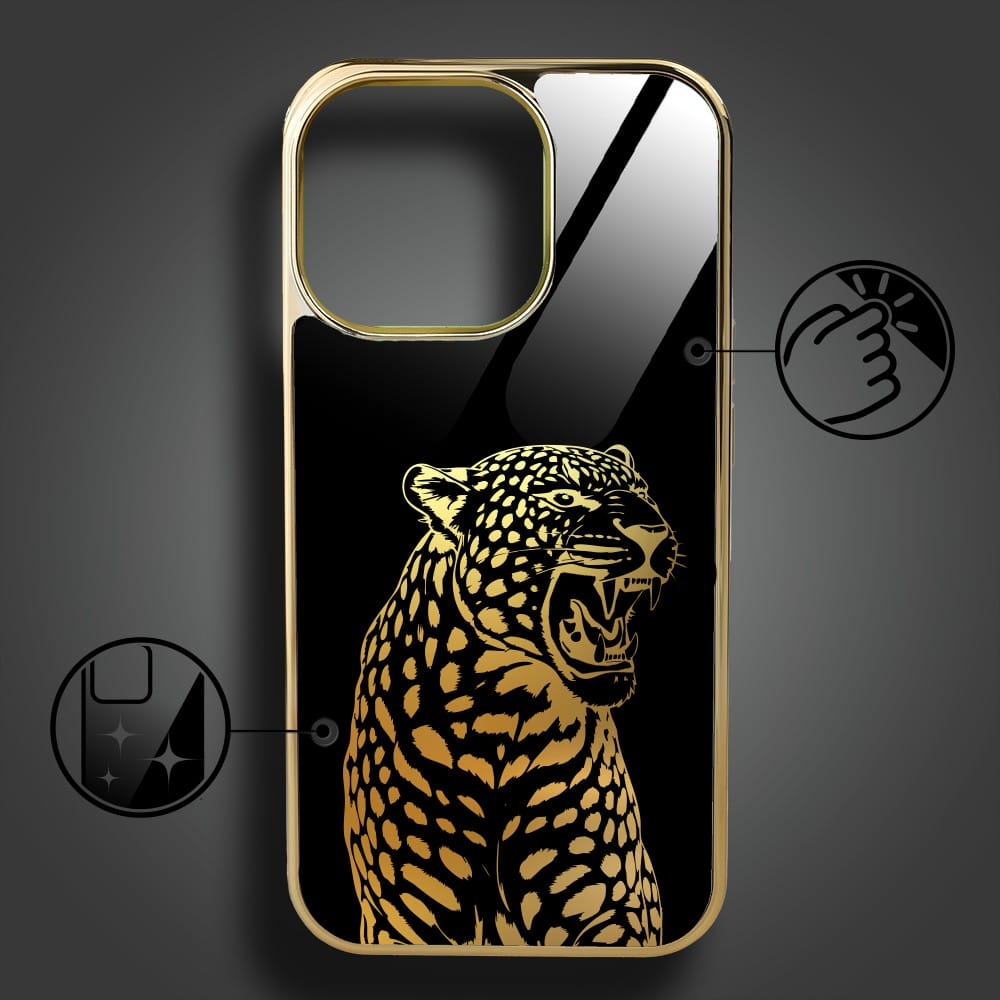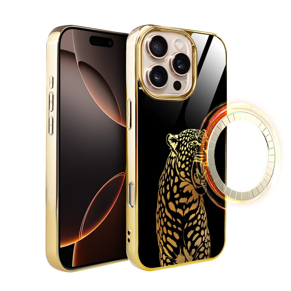 Etui do iPhone 16 Pro IBIZU Elite Glass z MagSafe Golden Midnight, Ryczący Jaguar, złote