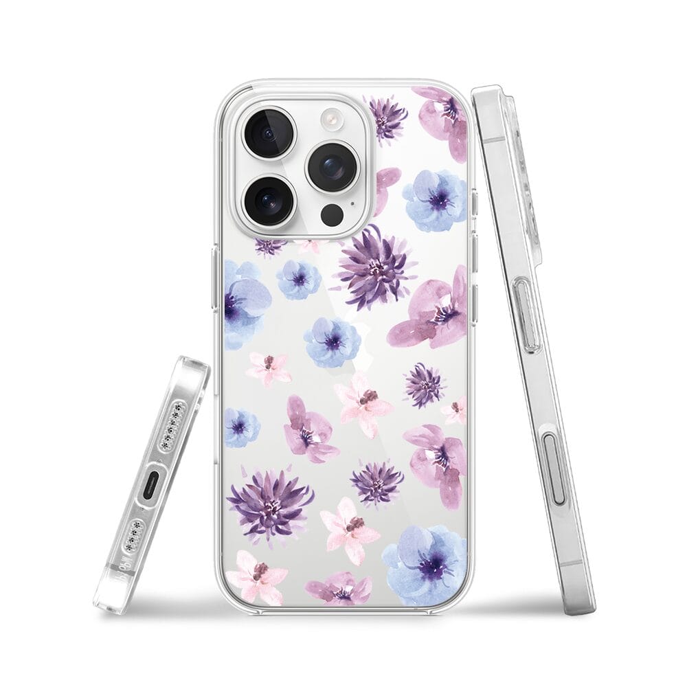 Etui do iPhone 16 Pro Max przeźroczyste, silikonowe Flexi, kwiatki niebieskie, fioletowe