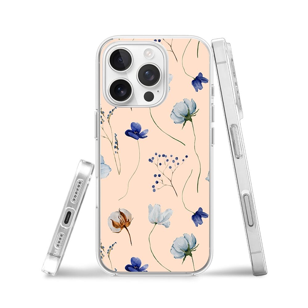 Etui do iPhone 16 Pro Max przeźroczyste, silikonowe Flexi, kwiatki niebieskie na pudrowym tle