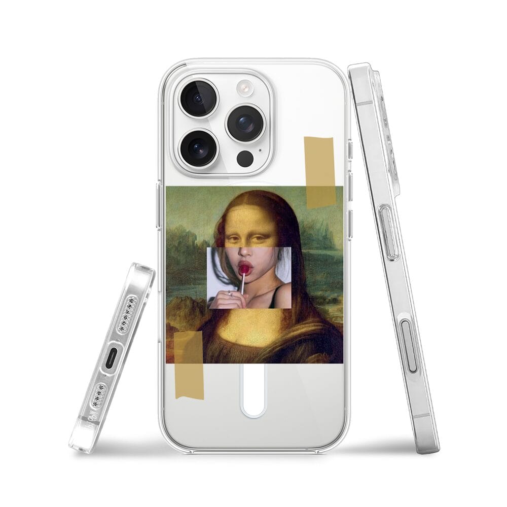 Etui do iPhone 16 Pro Max z MagSafe przeźroczyste, silikonowe Flexi, Mona Lisa z lizakiem