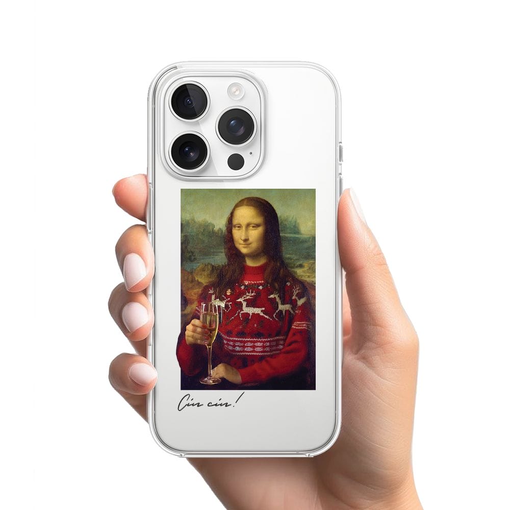 Etui do iPhone 16 Pro świąteczna Mona Lisa z szampanem, przeźroczyste