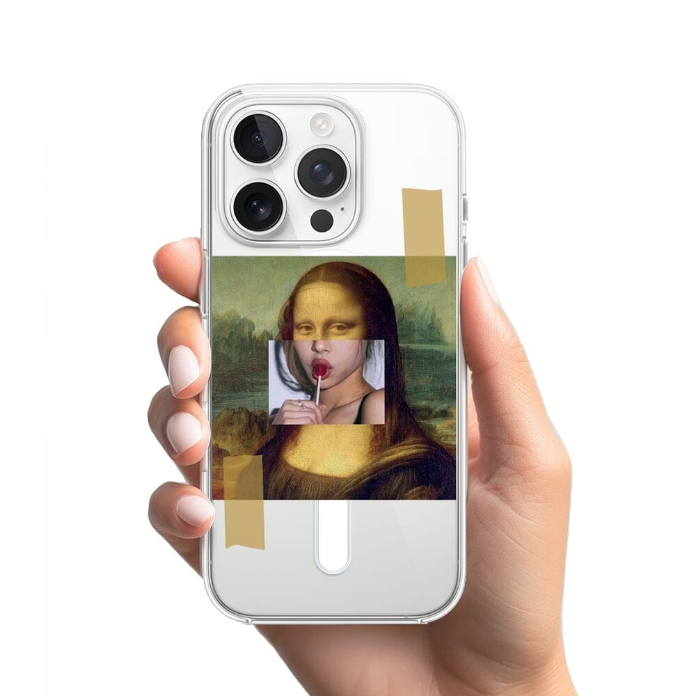 Etui do iPhone 16 Pro z MagSafe przeźroczyste, silikonowe Flexi, Mona Lisa z lizakiem