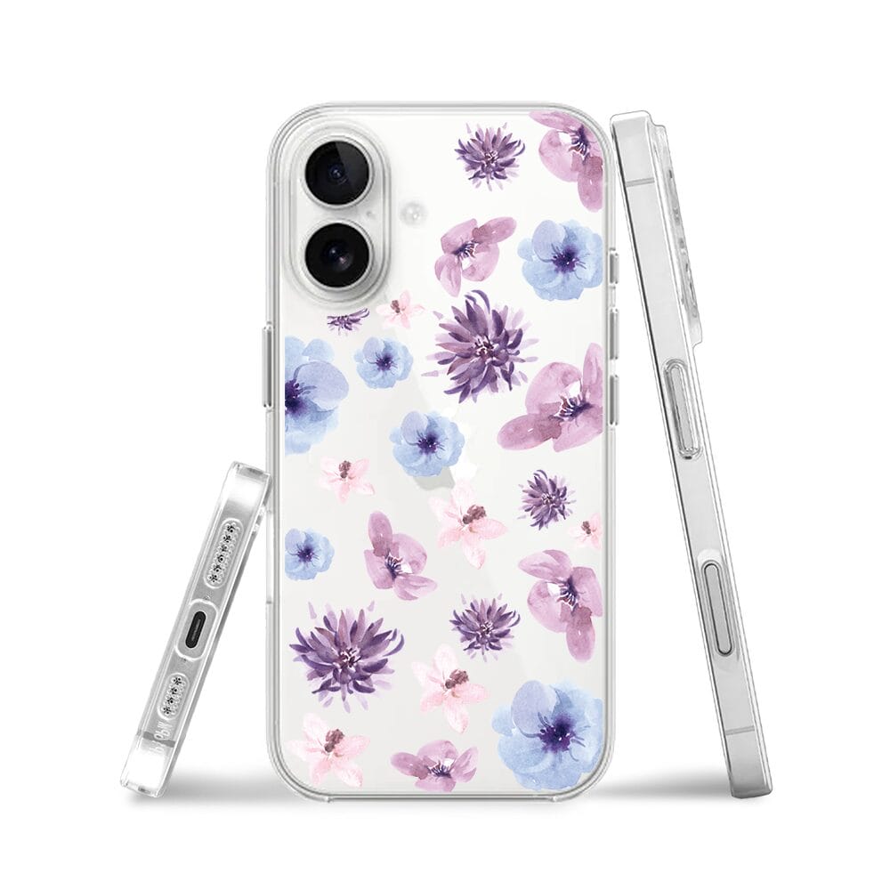 Etui do iPhone 16 przeźroczyste, silikonowe Flexi, kwiatki niebieskie, fioletowe