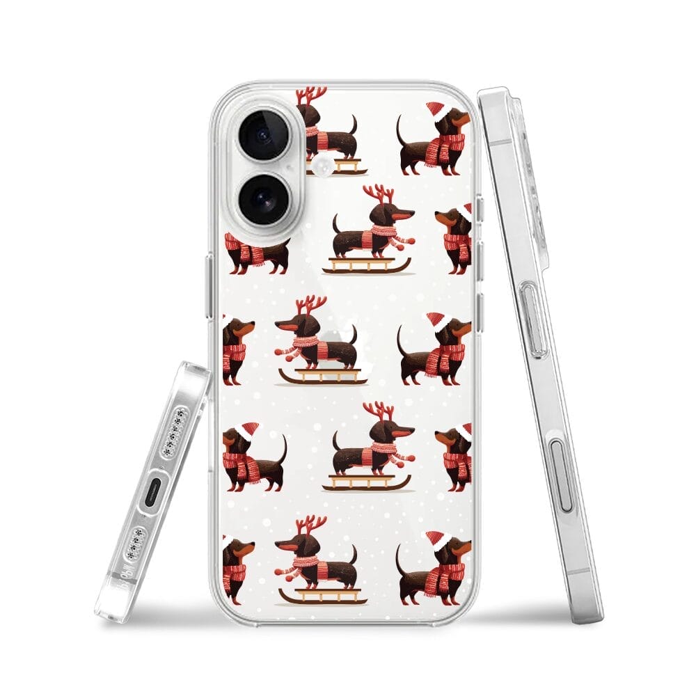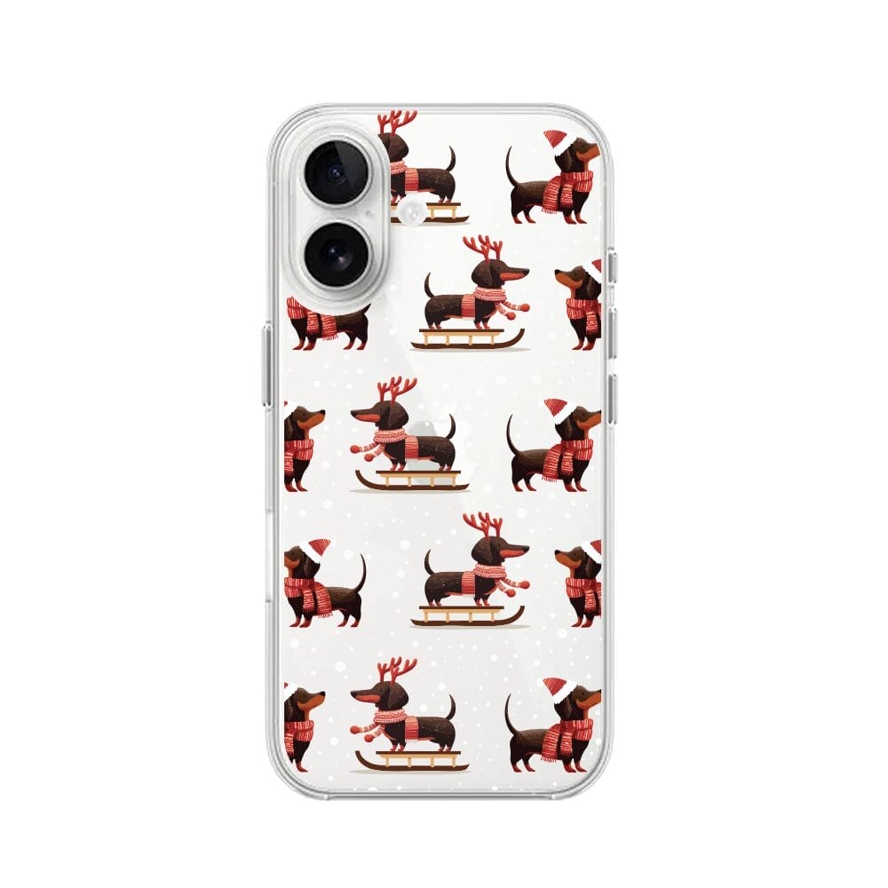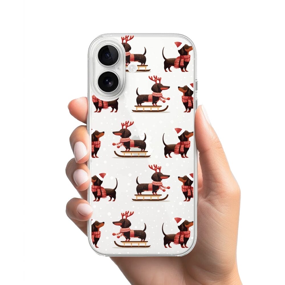 Etui do iPhone 16 przeźroczyste, silikonowe Flexi, Przytulne święta, Jamniki na saniach