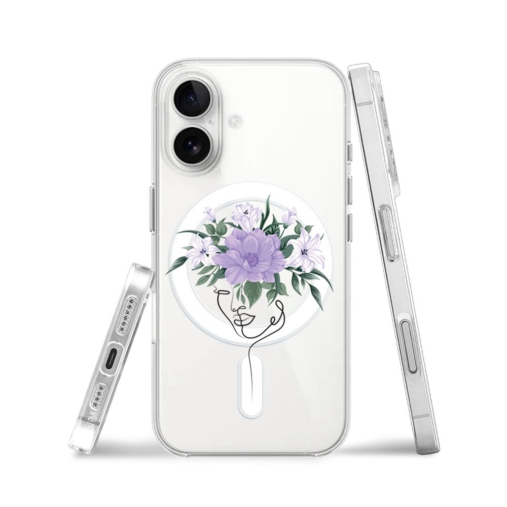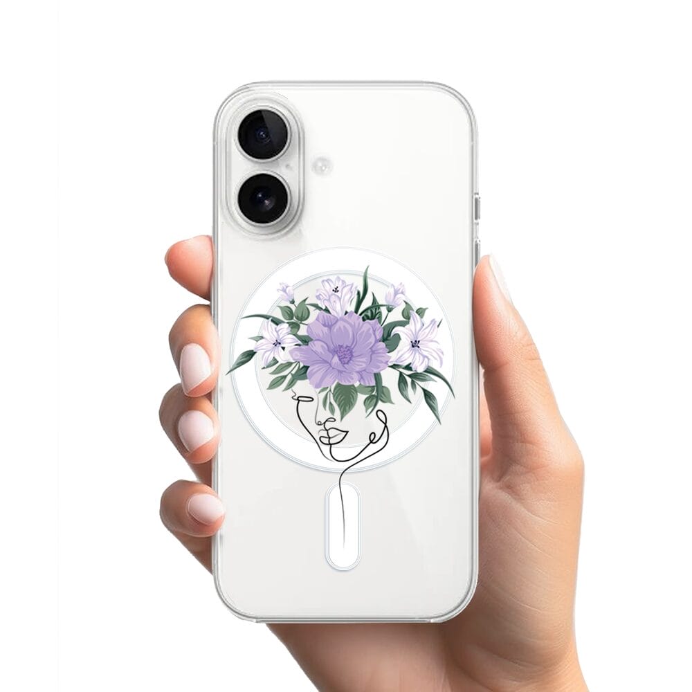 Etui do iPhone 16 z MagSafe przeźroczyste, silikonowe Flexi, kobieta z kwiatami