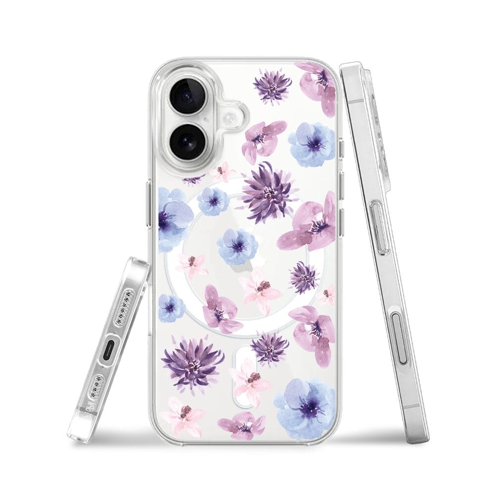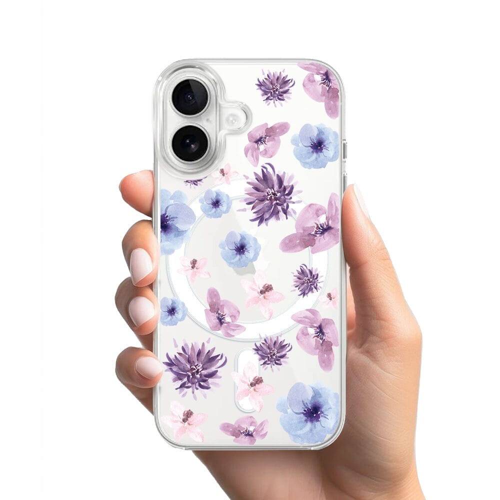 Etui do iPhone 16 z MagSafe przeźroczyste, silikonowe Flexi, kwiatki niebieskie, fioletowe