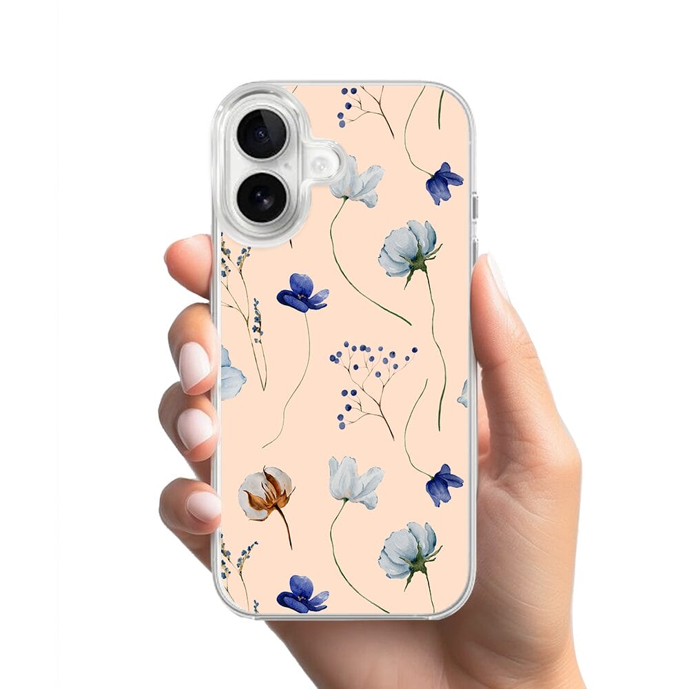 Etui do iPhone 16 z MagSafe przeźroczyste, silikonowe Flexi, kwiatki niebieskie na pudrowym tle