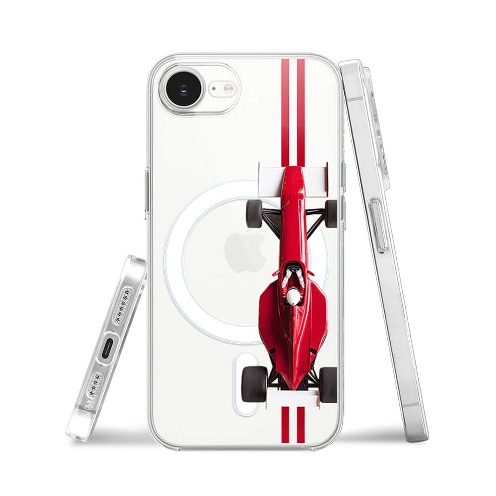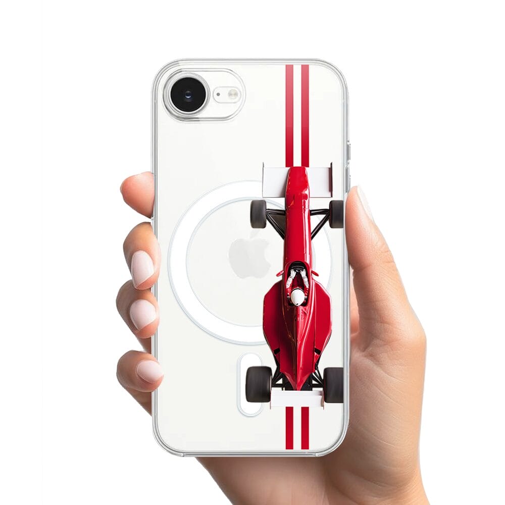 Etui do iPhone 16e z MagSafe przeźroczyste, silikonowe Flexi, Szybkie Auta, czerwone F1
