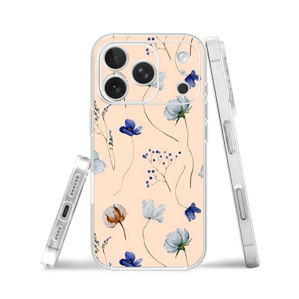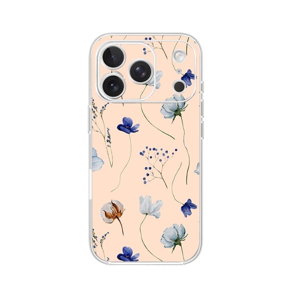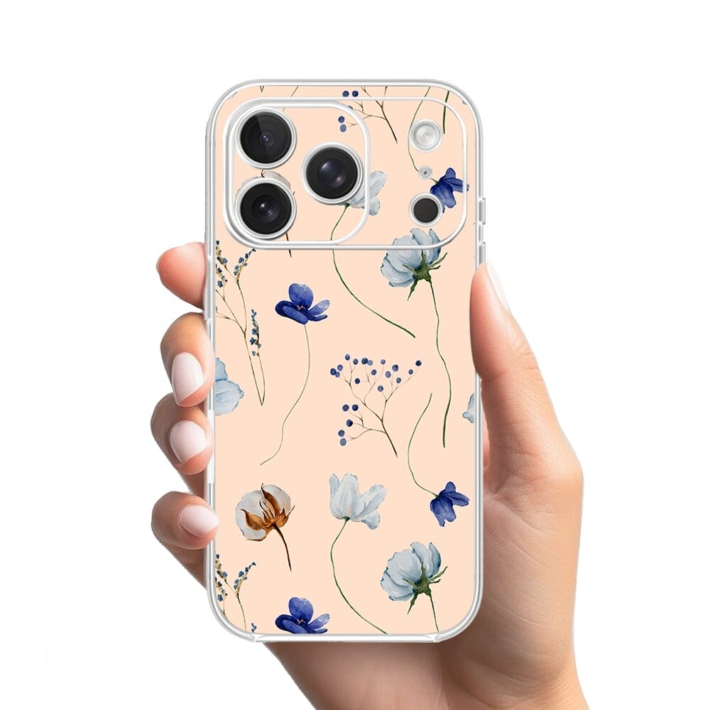 Etui do iPhone 17 Pro Max przeźroczyste, silikonowe Flexi, Summer Patterns, kwiatki niebieskie na pudrowym tle