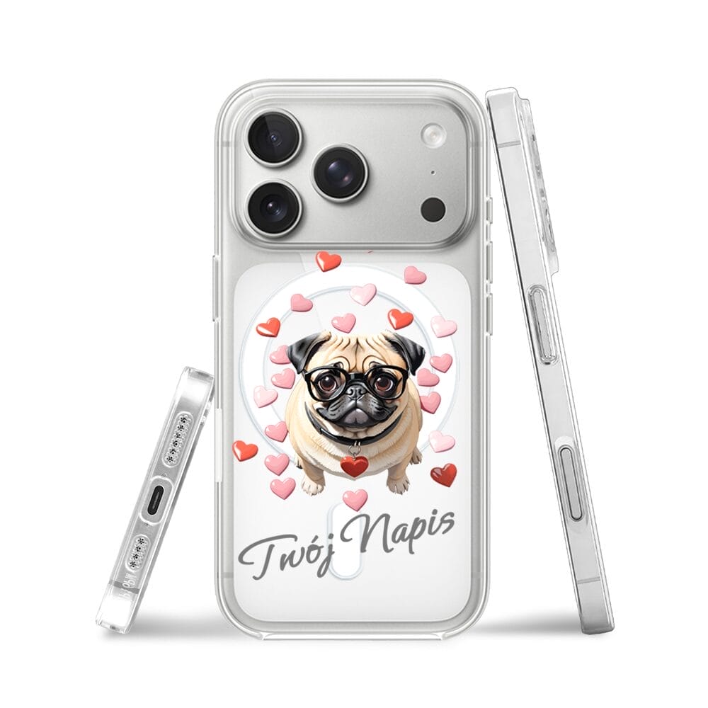 Etui do iPhone 17 Pro Max z MagSafe przeźroczyste, silikonowe Flexi, Puppy Love, pies rasy Mops