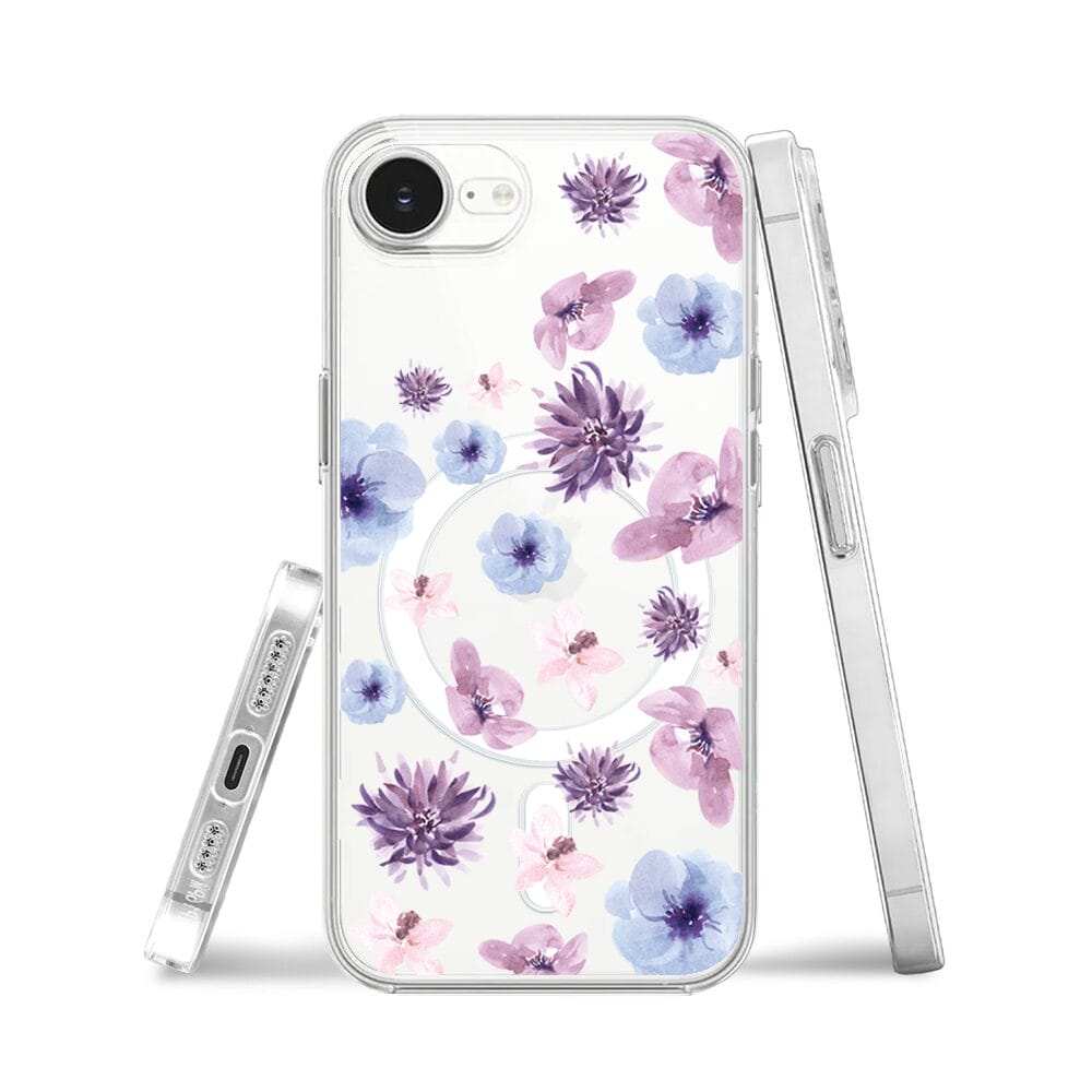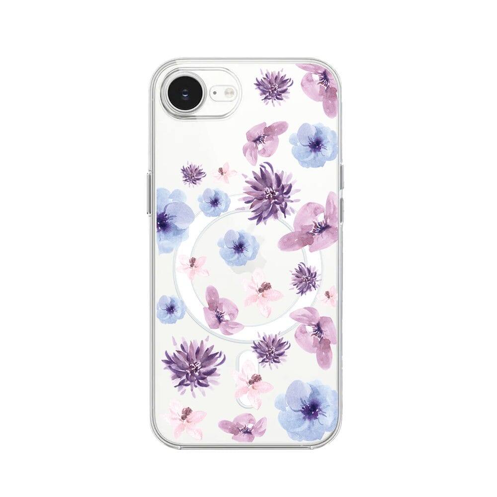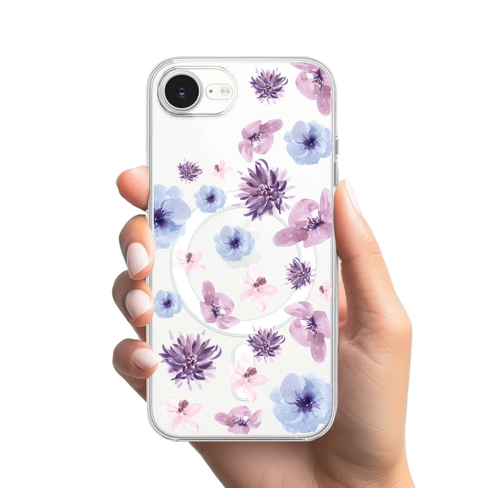 Etui do iPhone 17e z MagSafe przeźroczyste, silikonowe Flexi, kwiatki niebieskie, fioletowe