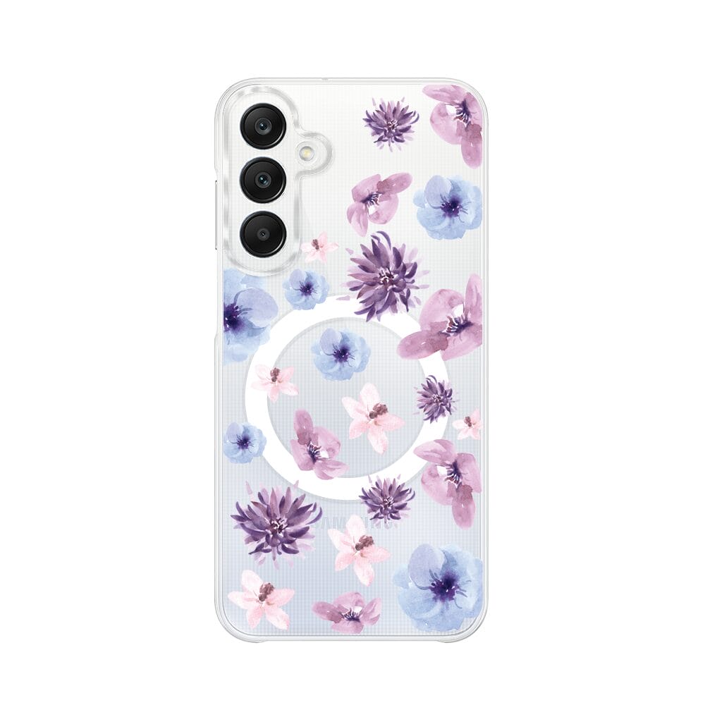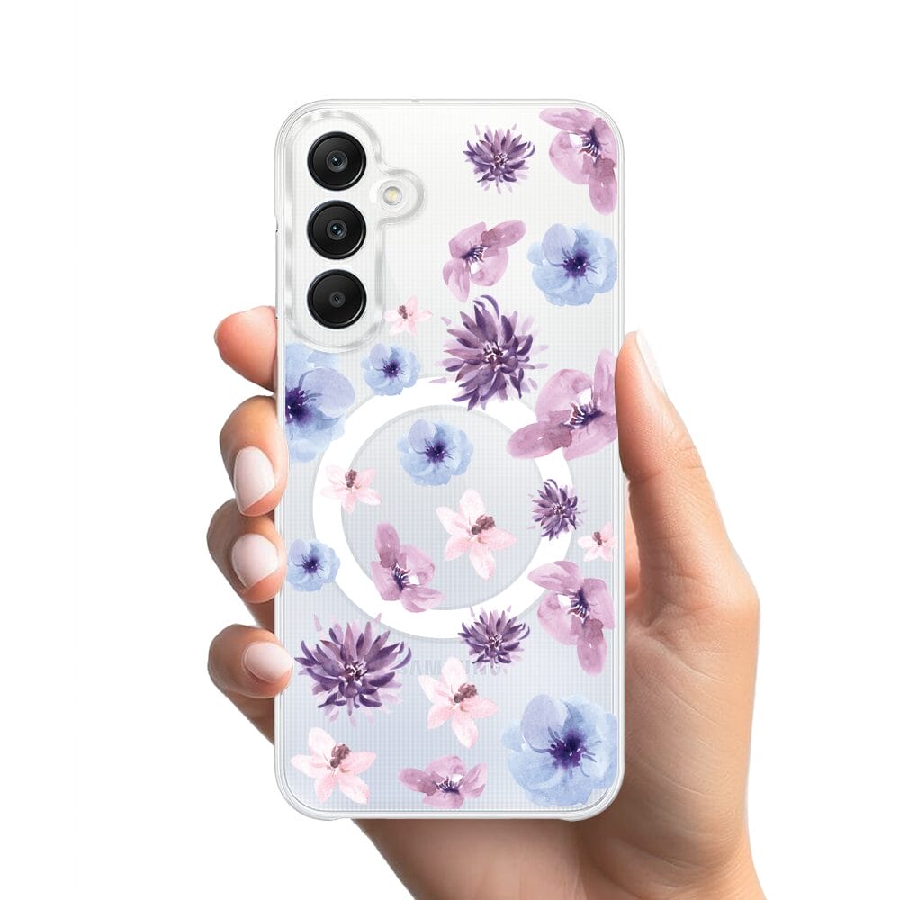 Etui do Samsung Galaxy A25 5G z MagSafe przeźroczyste, silikonowe Flexi, kwiatki niebieskie, fioletowe