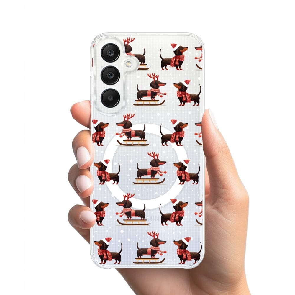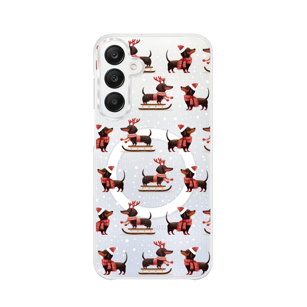 Etui do Samsung Galaxy A25 5G z MagSafe przeźroczyste, silikonowe Flexi, Przytulne święta, Jamniki na saniach